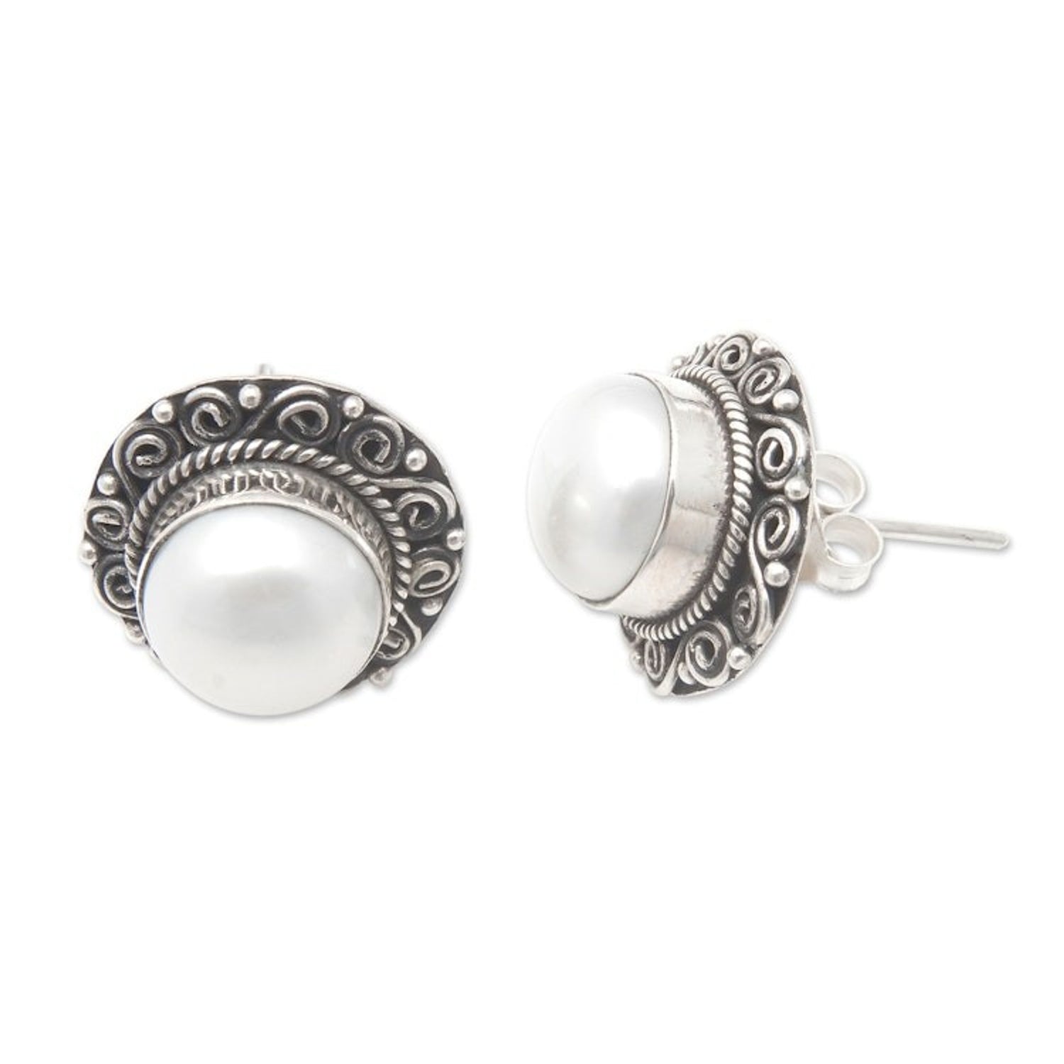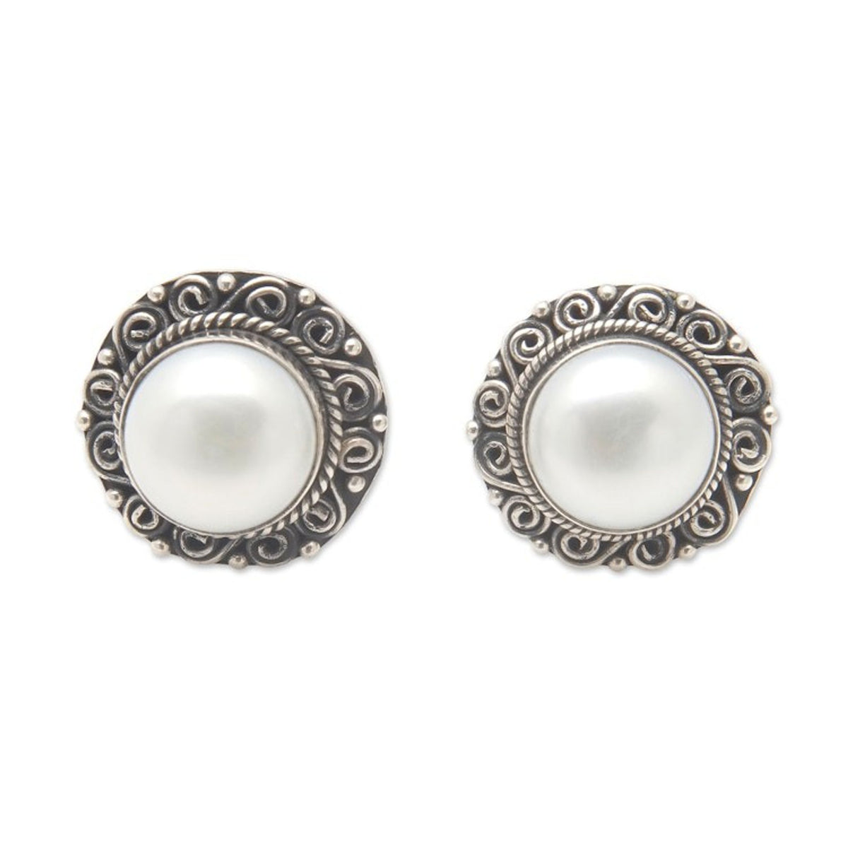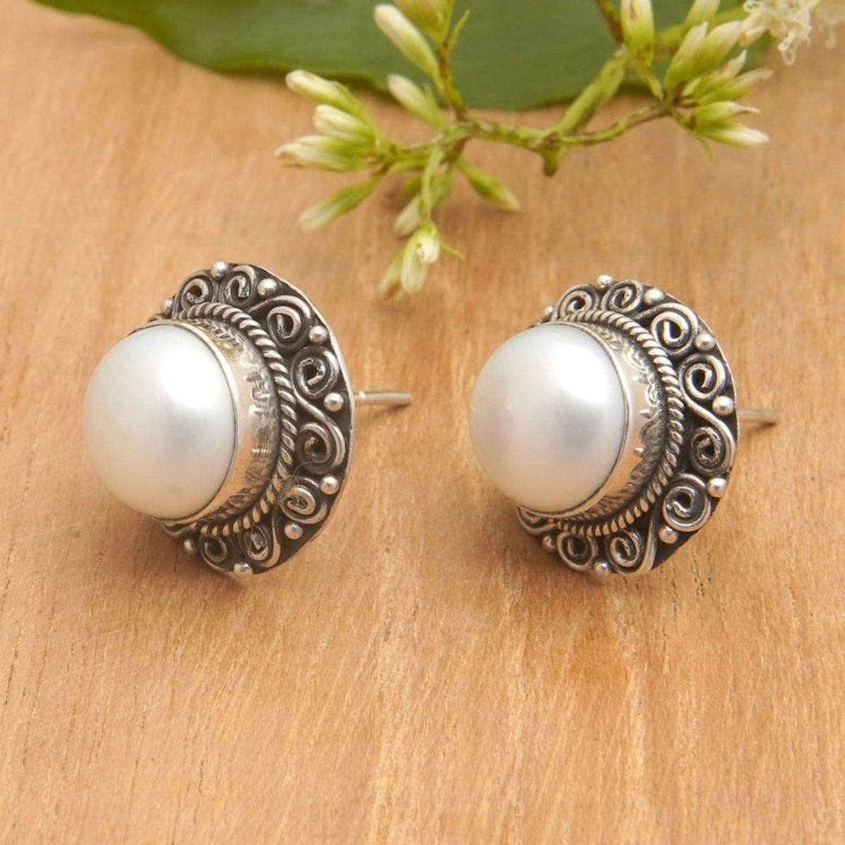 Balinese Floral Silver-White Cultured Pearl Button Earrings 'Pearly Balinese'