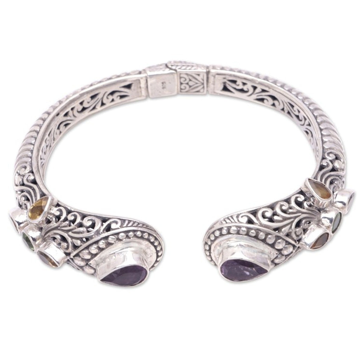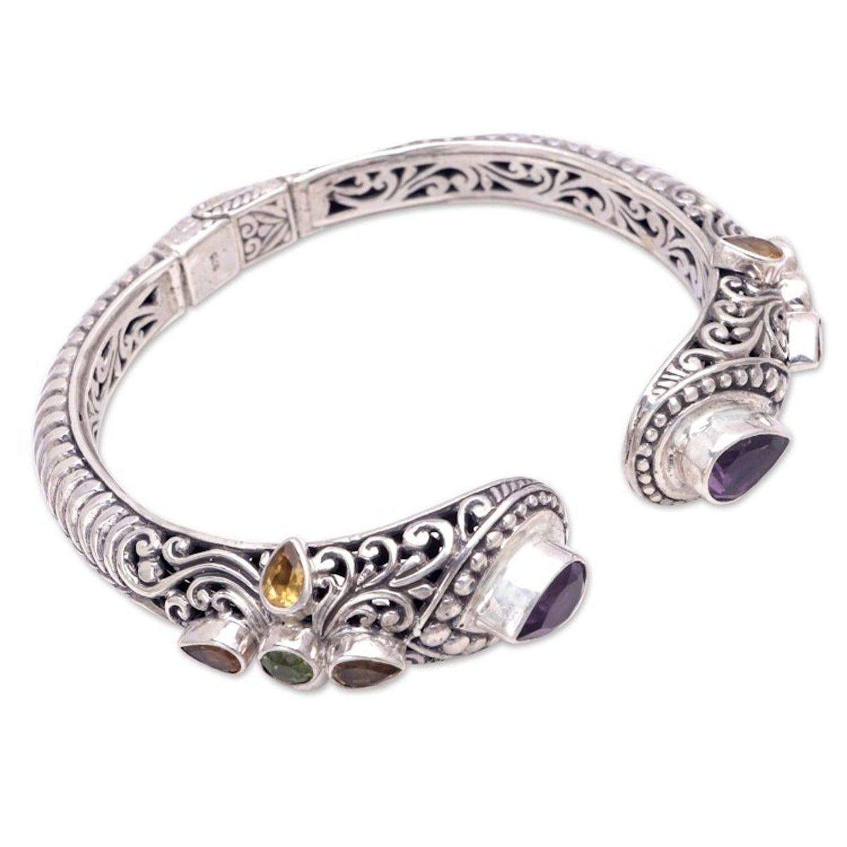 This cuff bracelet is crafted from 925 sterling silver, amethyst, citrine, and peridot with a combination finish. It features a concealed hinge and measures 7 inches L (end to end) x 0.5 inches W.