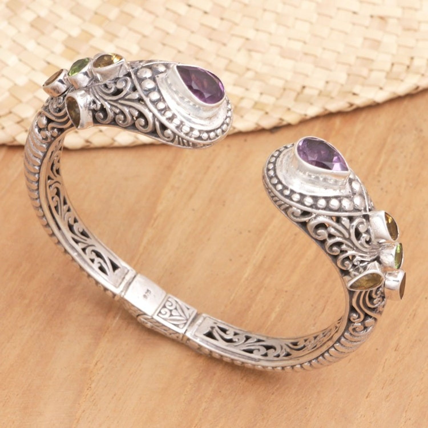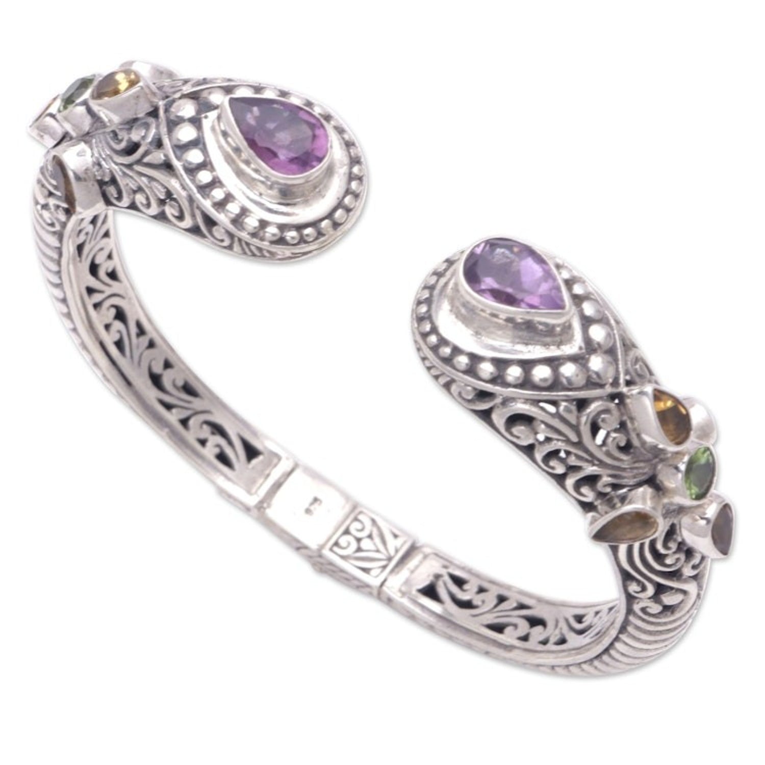 This 'Shining Woman' by Independent Artisans is a glamorous sterling silver cuff bracelet that is embellished with multiple gemstones. Designed by Giri Tasmana, the bracelet features traditional Balinese motifs surrounding faceted amethyst, citrine, and peridot gems that total over three carats. The unique accessory has a concealed hinge and a glowing style that will complement any elegant or casual outfit.