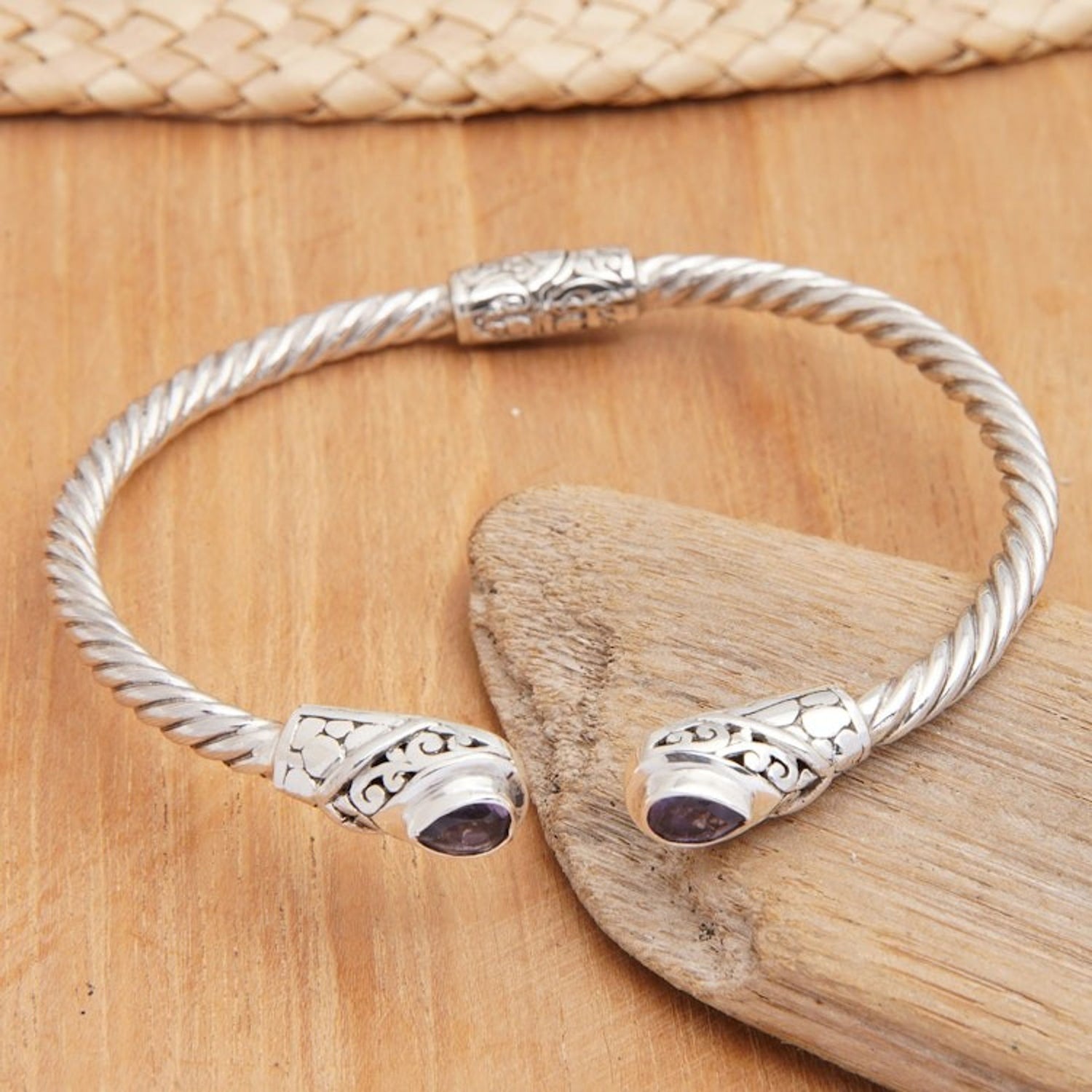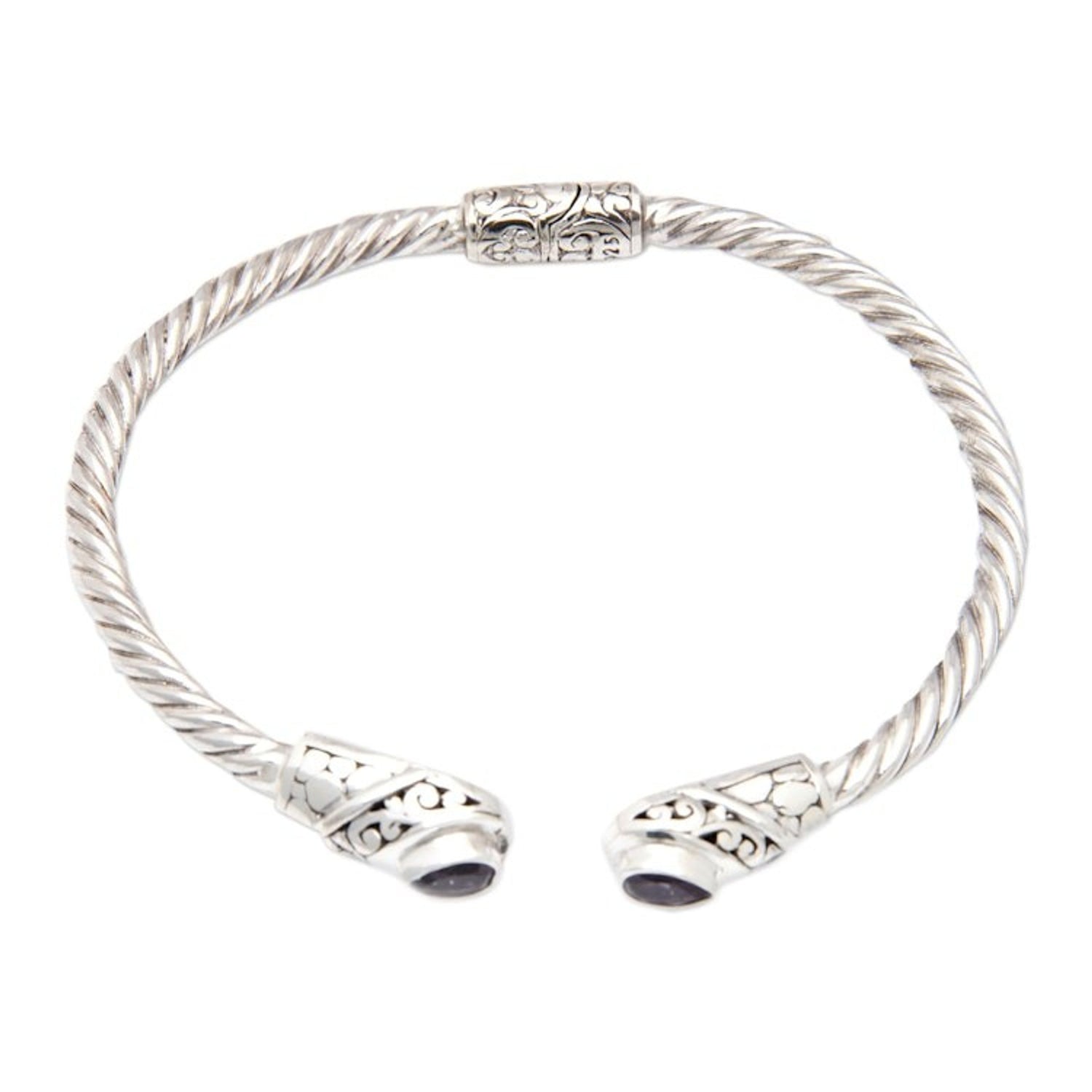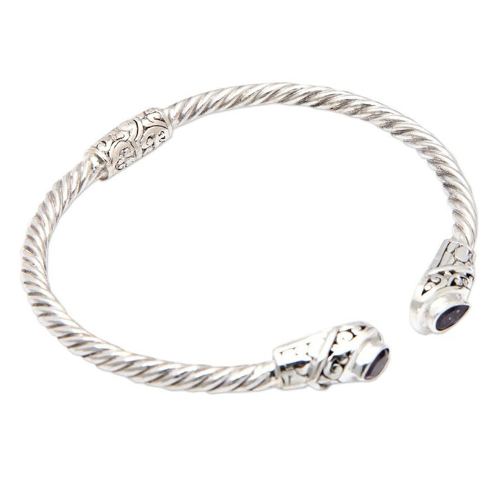 Balinese Sterling Silver Cuff Bracelet with Amethyst Gems 'Spiritual Fates'