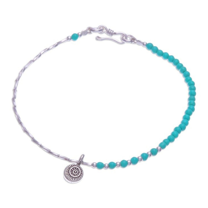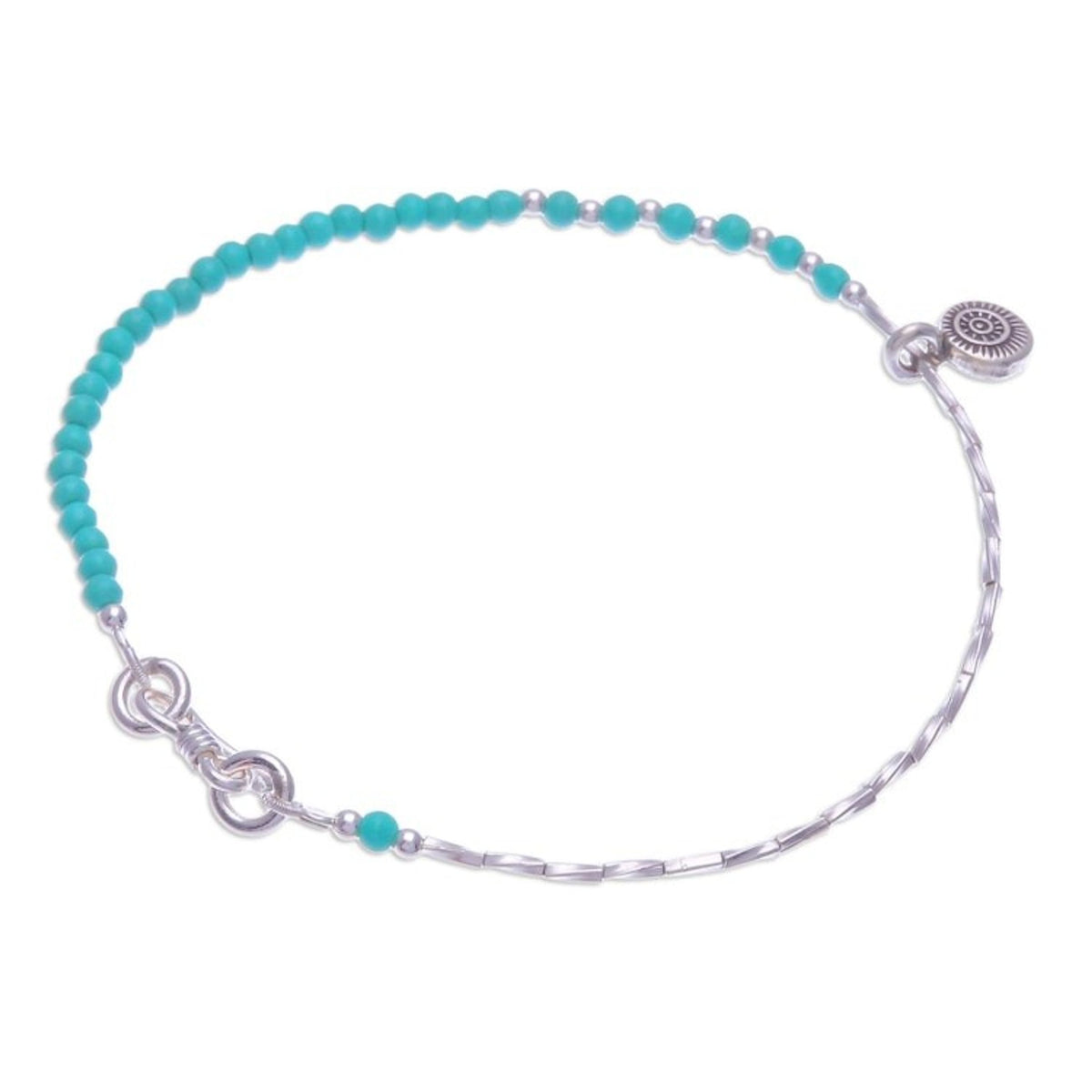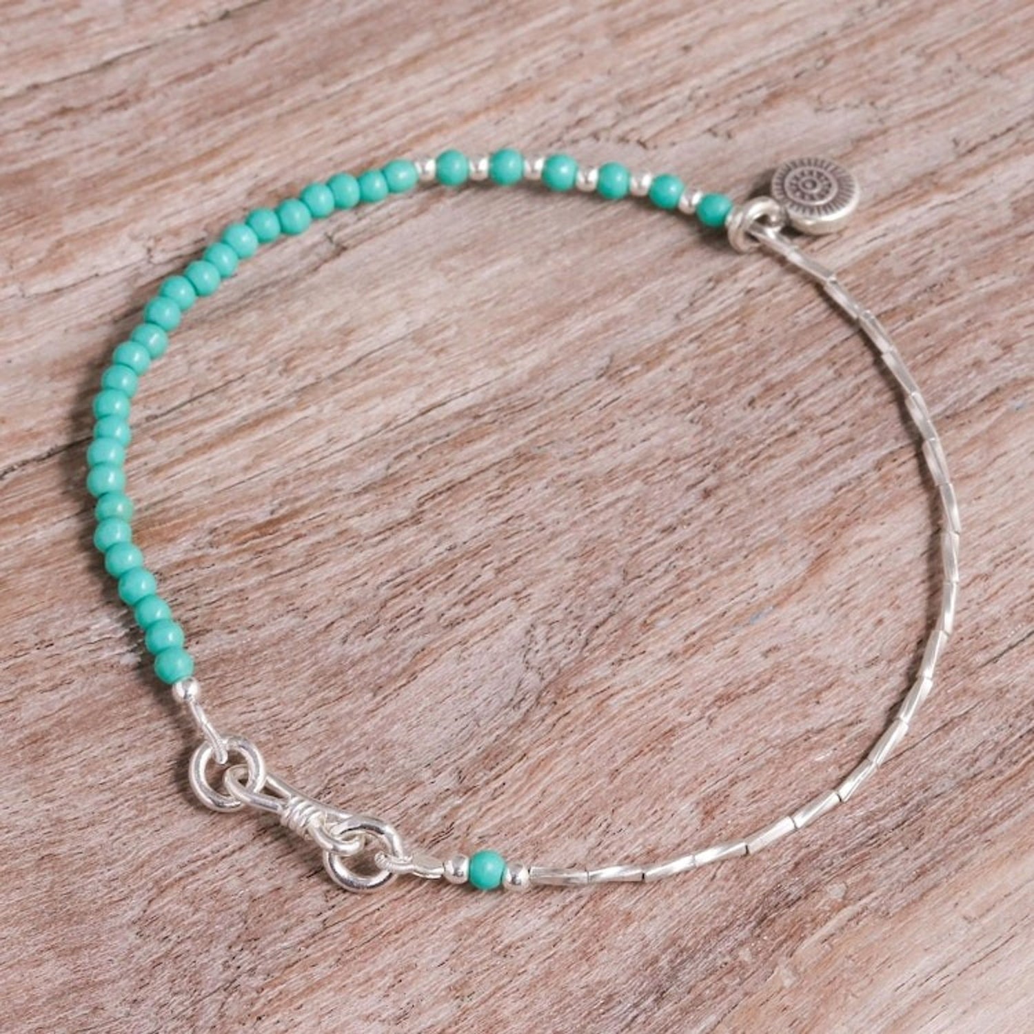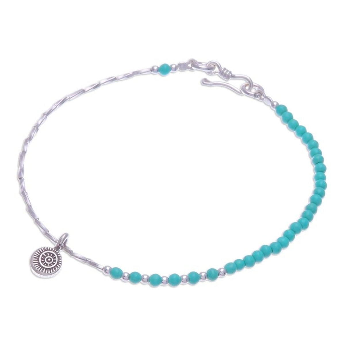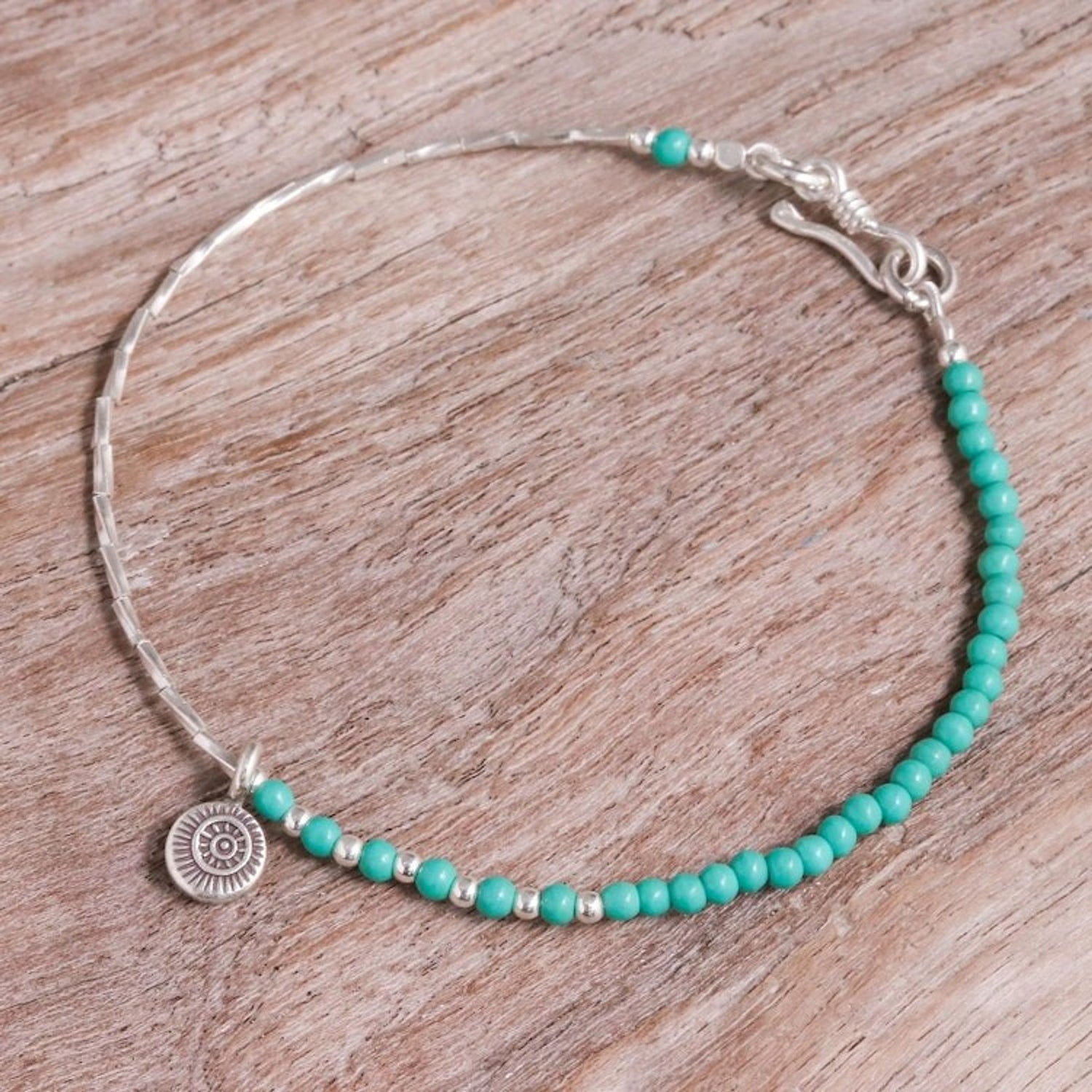 This 'Meditation Charm' by Independent Artisans is a marvelous accessory featuring howlite gems, which are believed to increase focus and meditation. Designed by Siranya, the bracelet has a charming turquoise tone and also features silver beads all over the design, with a hill tribe charm as a cute centerpiece. The piece is a beautiful blend of artistry with lived experience and storytelling.