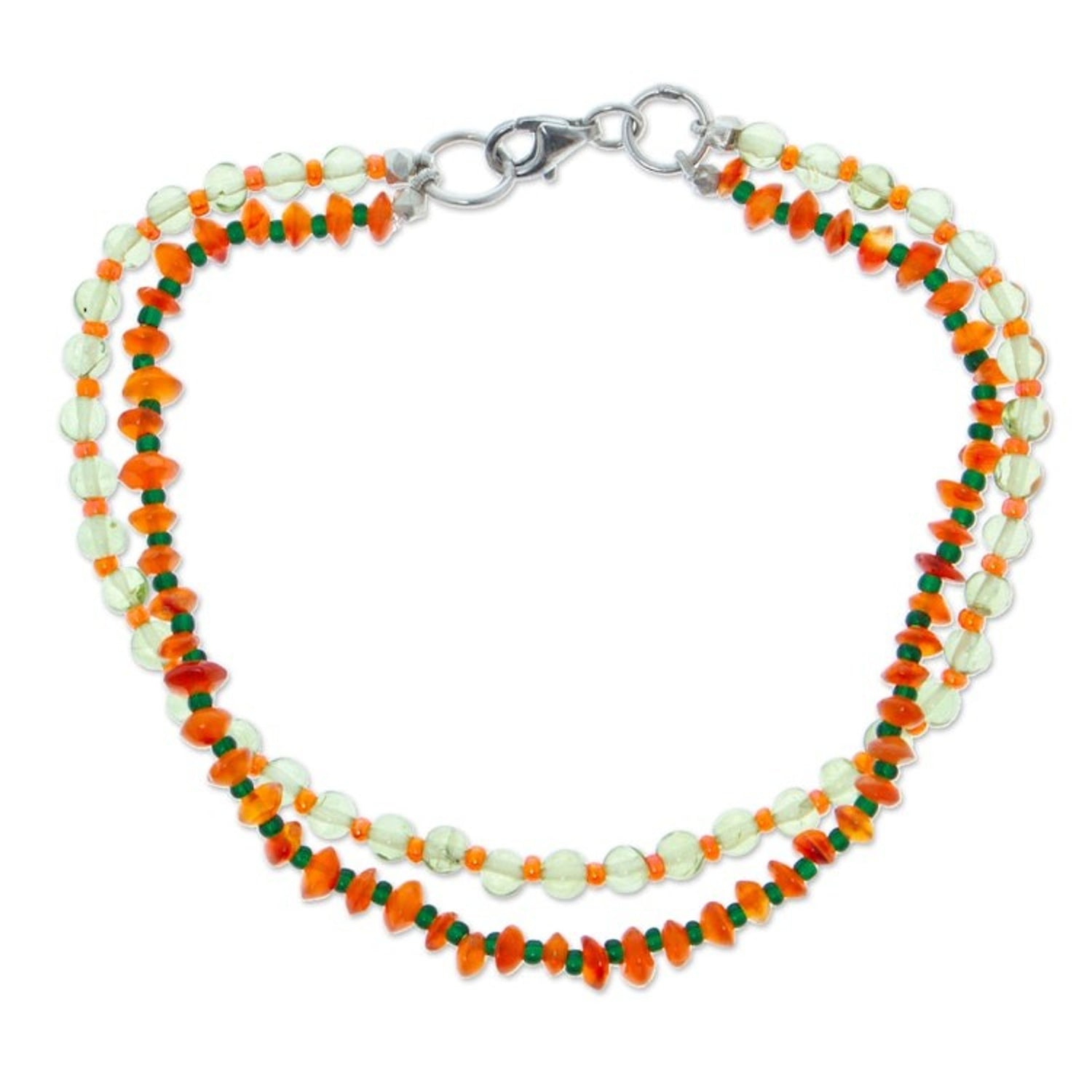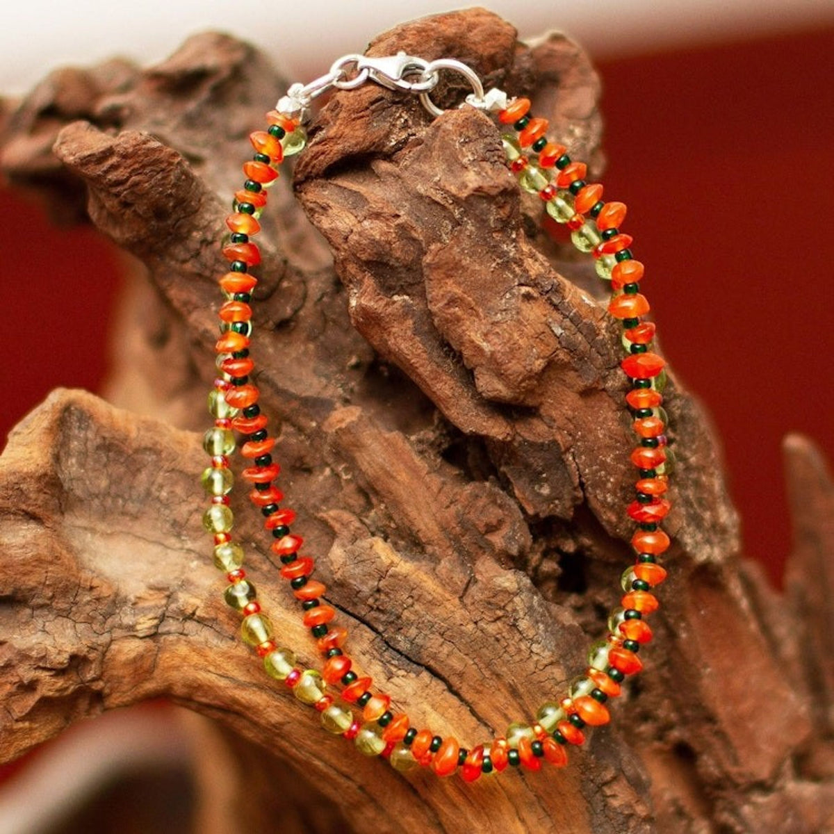 This bracelet is crafted from peridot, carnelian, tiny glass beads, and 925 sterling silver with a high-polish finish. It features a lobster claw clasp and measures 7.5 inches in inner circumference and 0.1 inches wide.
