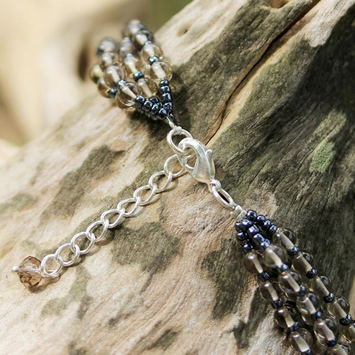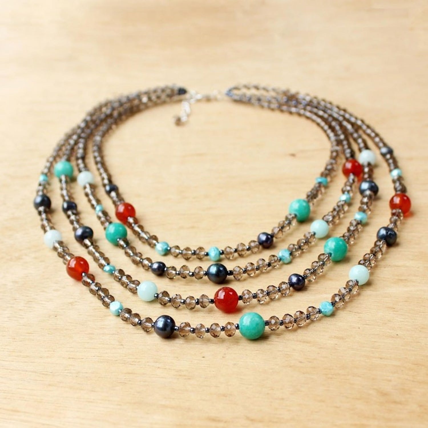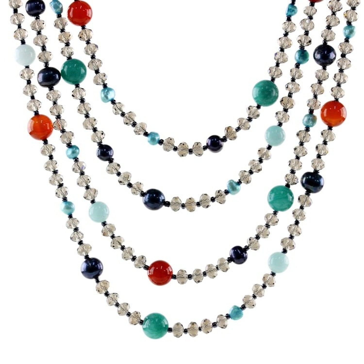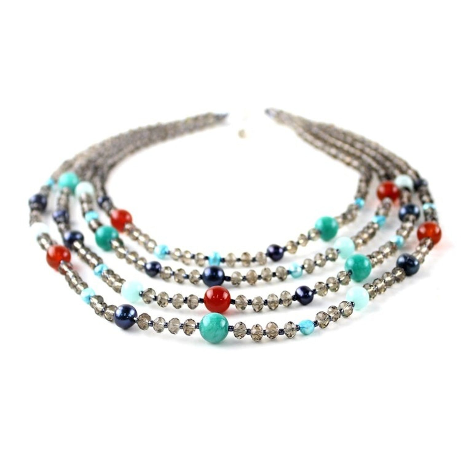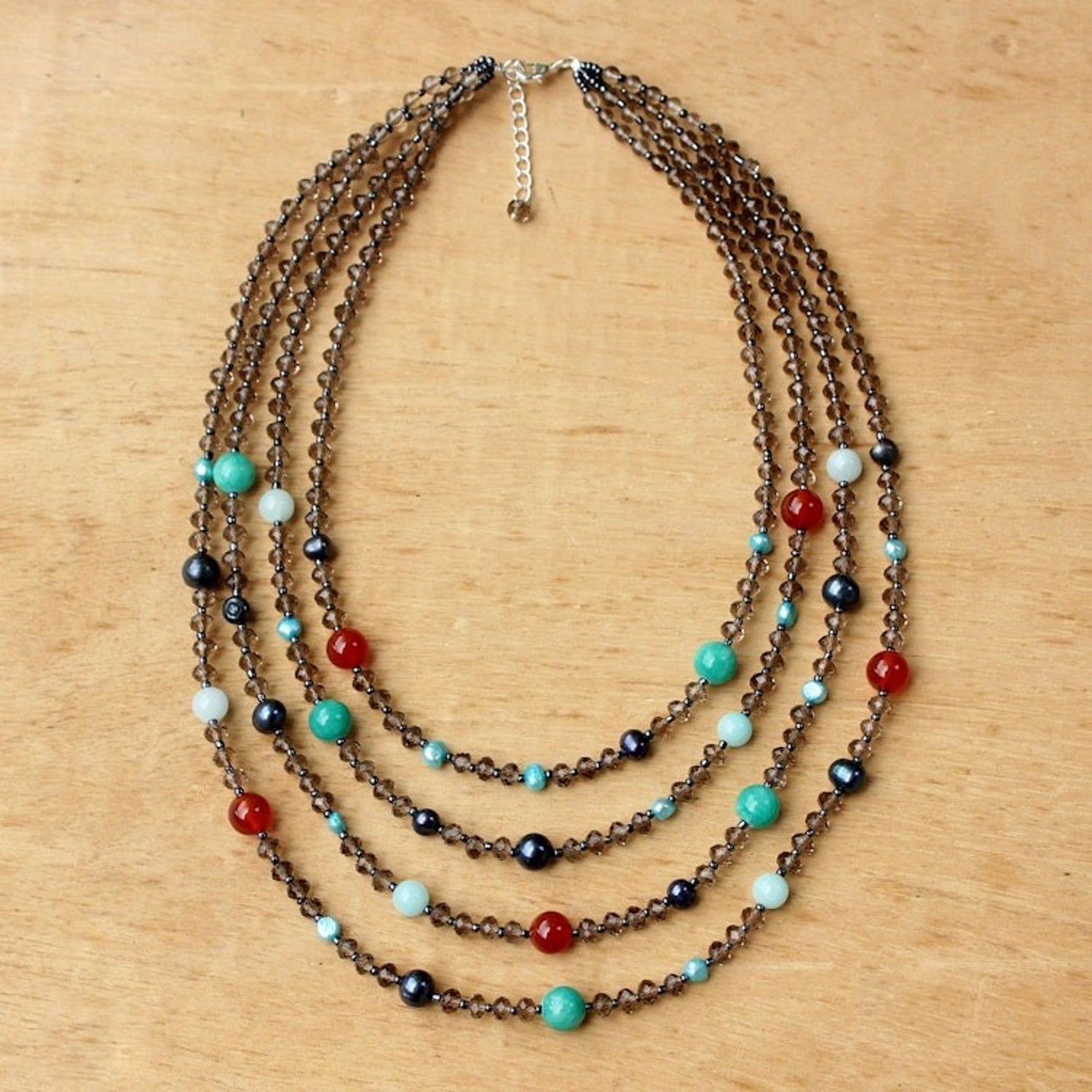 This 'Changing Seasons' by Independent Artisans is a multi-strand beaded necklace that creates a stunning contrast of colors. Designed by Nareerat, it is handcrafted with multicolored gems and pearls, as well as sparkling smoky glass beads. The necklace is a beautiful celebration of nature and color, and it closes with a sterling silver plated brass lobster claw clasp.
