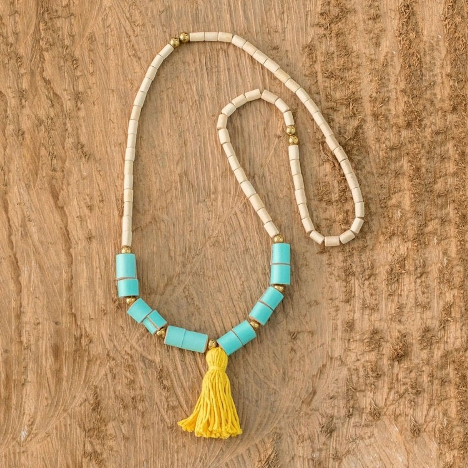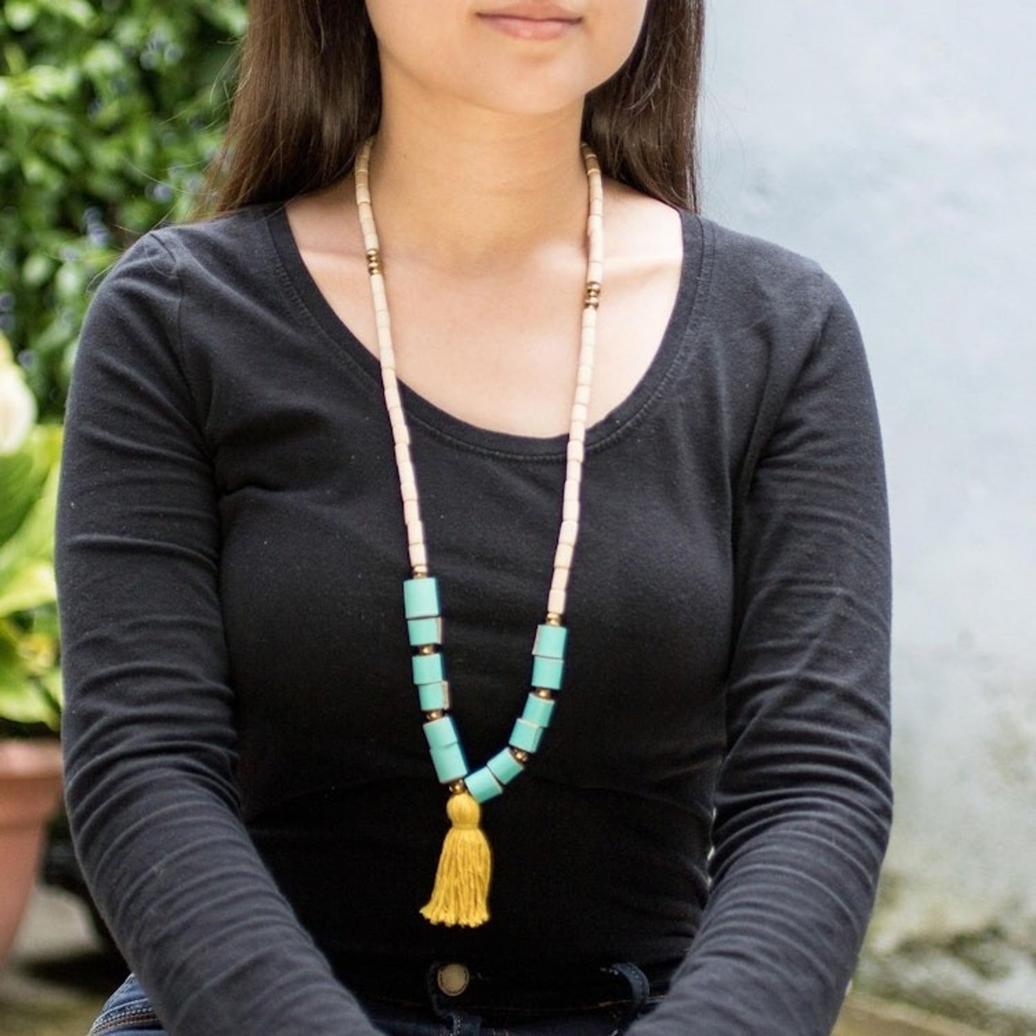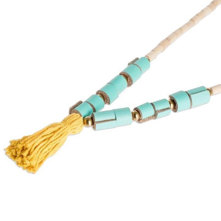This 'San Francisco Bohemian' by Independent Artisans is a beautifully bohemian necklace. Designed by Rebeca Zamora, the long necklace is crafted from tubes of aqua leather, natural pinewood beads, and golden hematite. A bright yellow cotton tassel is added as a pendant, making it a perfect piece for a free spirit that merges originality with cultural pride.