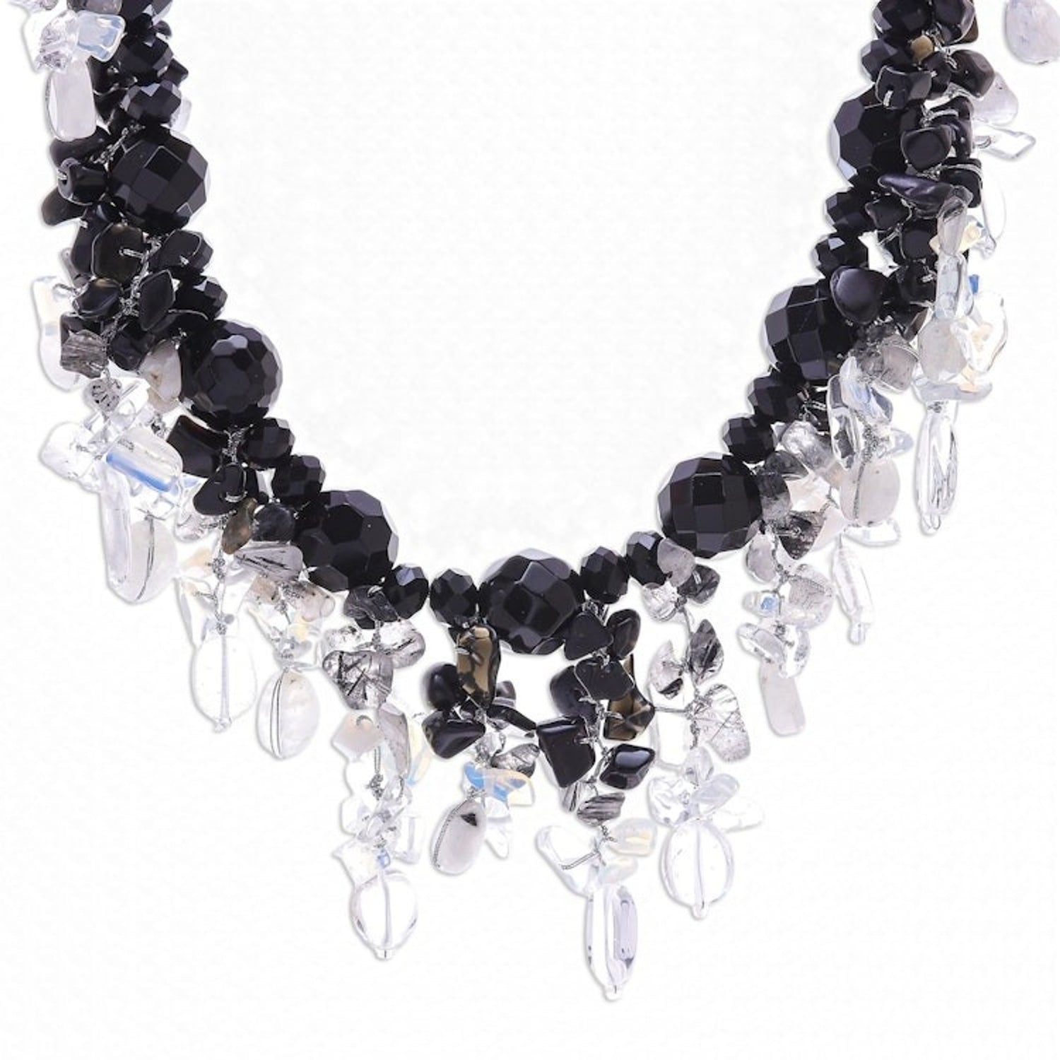 This 'Sparkling Night' by Independent Artisans is a beautiful beaded necklace. Designed by Nareerat, it features a cascade of black and white gemstones, including rainbow moonstone, onyx, quartz, and tourmalinated quartz strands of graduated lengths. The polished chips and faceted beads are hand-strung, creating a dazzling piece that can be worn day or night.