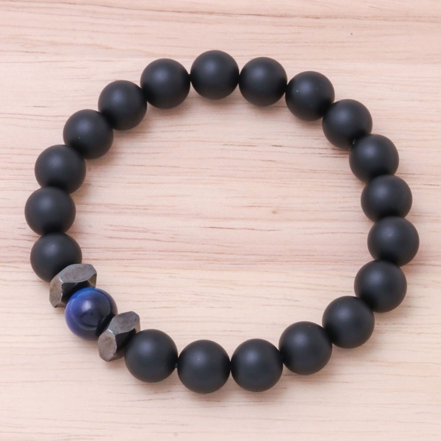 This bracelet is crafted from onyx, dyed tiger's eye, and hematite. It measures 7 inches in inner circumference and 10 mm wide.