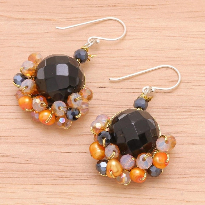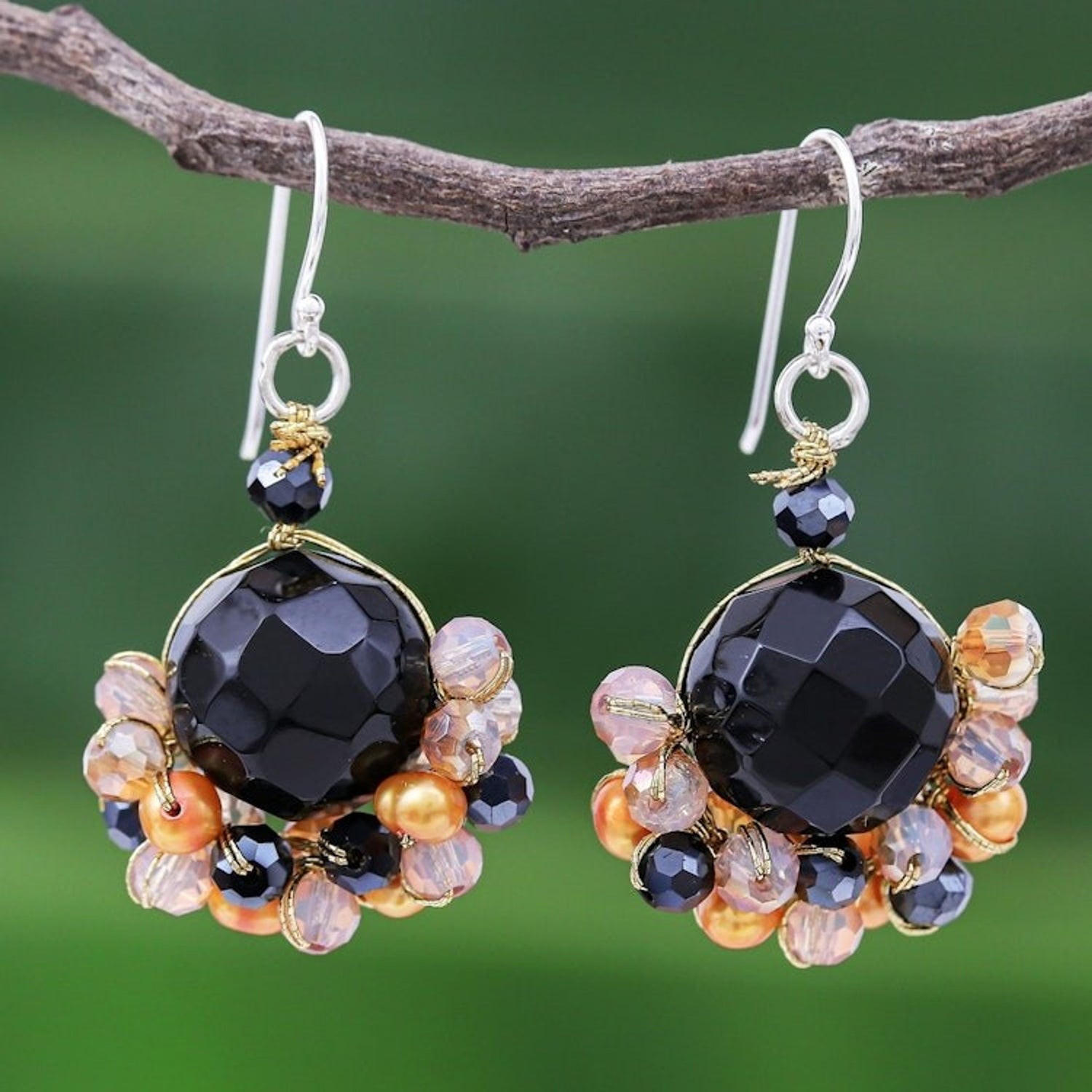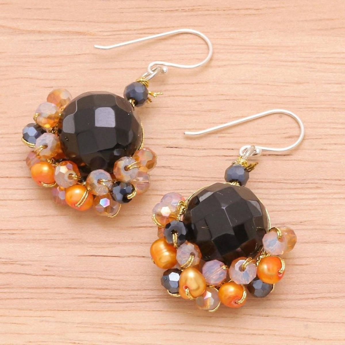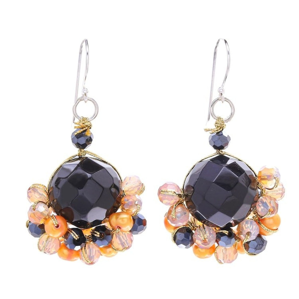 These 'Vivid Dream in Orange' by Independent Artisans are a beautiful pair of dangle earrings. Designed by Nareerat, round faceted onyx beads take center stage, suspended from sterling silver hooks. The deep black gemstones are accented by a cluster of orange cultured freshwater pearls interspersed with faceted glass beads, which are hand-strung on silk thread.