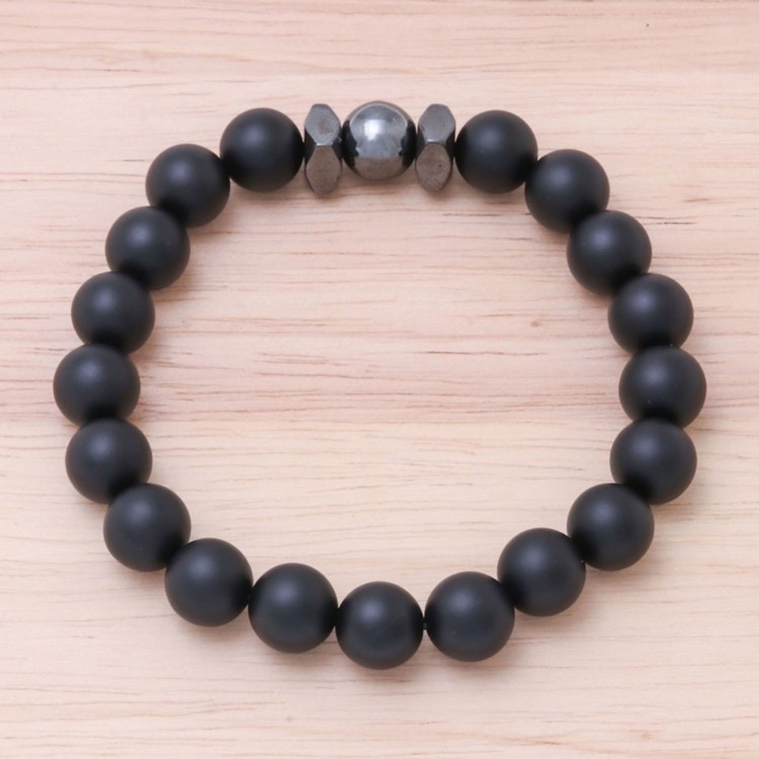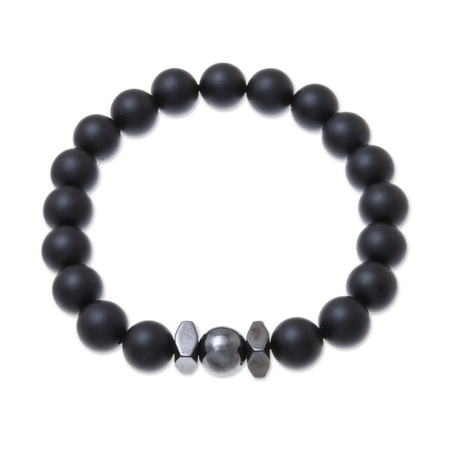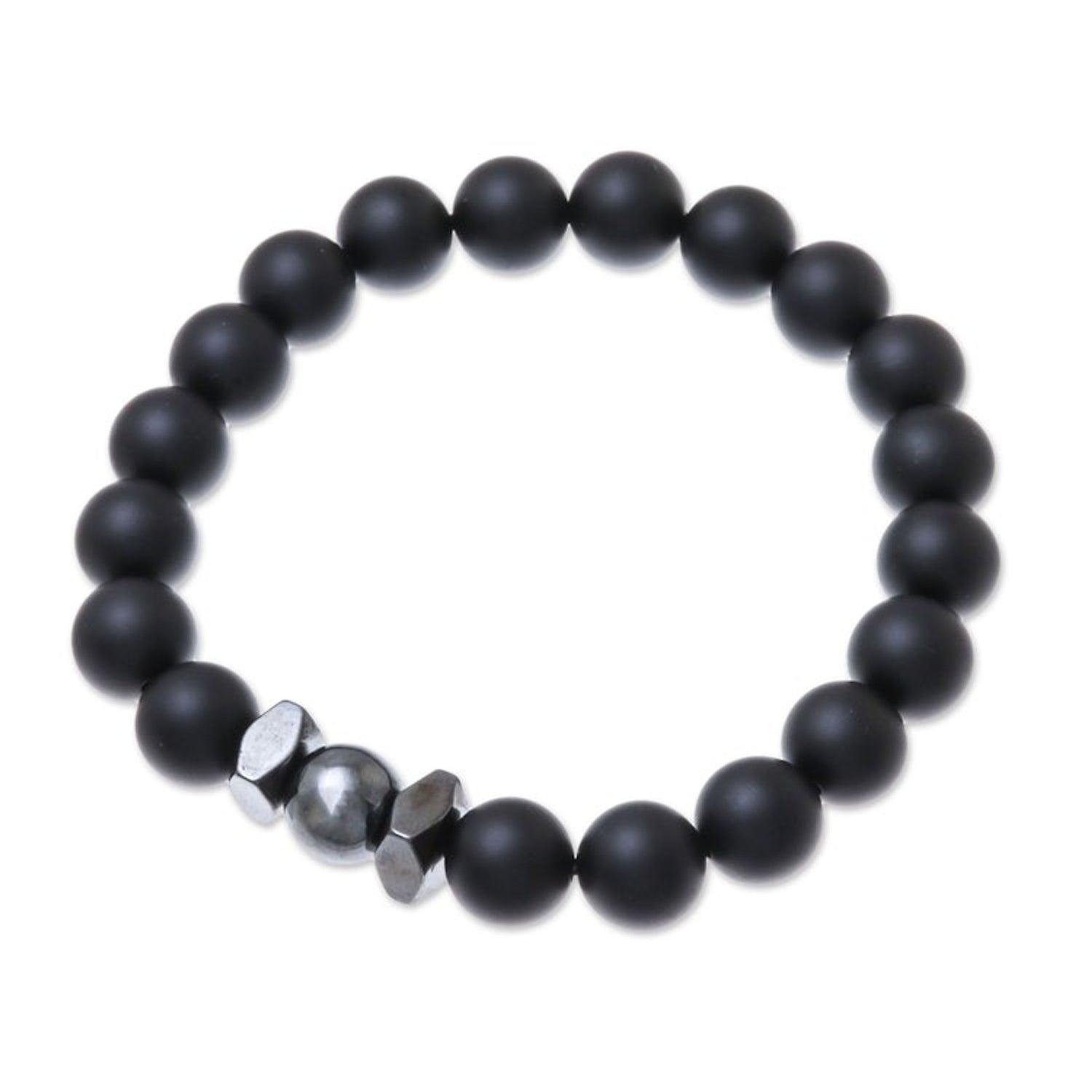 This bracelet is crafted from onyx and hematite. It measures 7 inches in inner circumference and 10 mm wide.