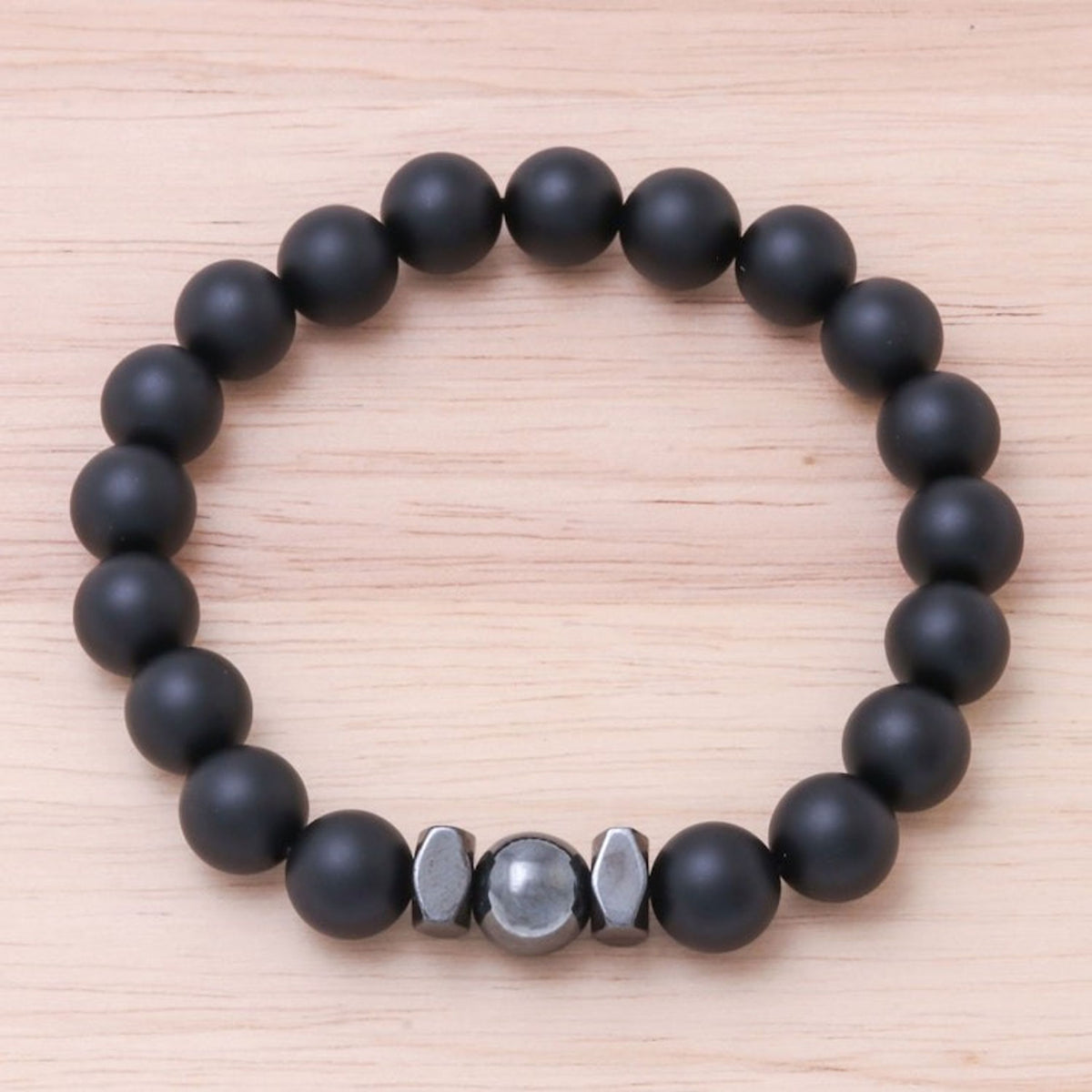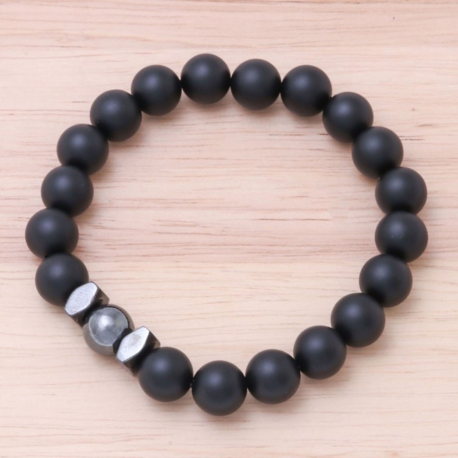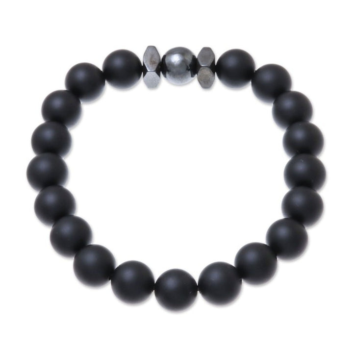 This bracelet is crafted from onyx and hematite. It measures 7 inches in inner circumference and 10 mm wide.