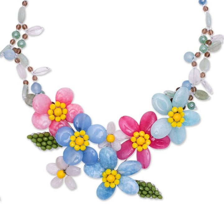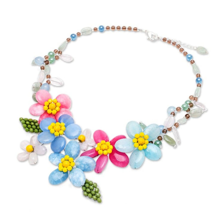 Blue and Pink Spring-Themed Quartz and Glass Beaded Necklace 'Paradisial Petals'