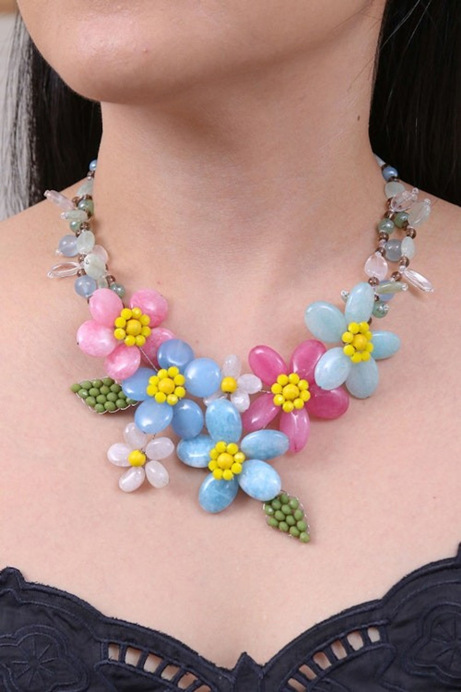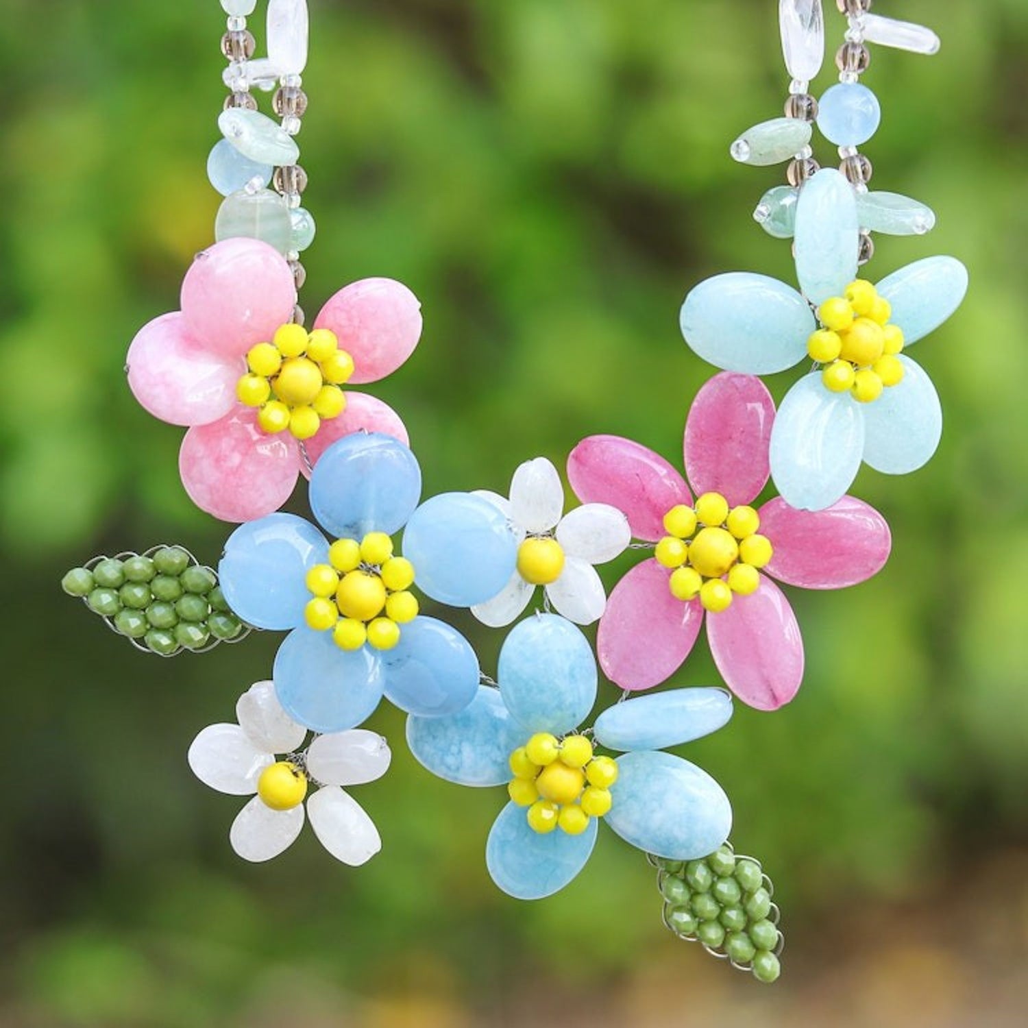 This 'Paradisial Petals' by Independent Artisans is a beautiful spring-themed necklace. Designed by Nareerat, it evokes the charming flowers of an Arcadian garden, using glass beads and quartz jewels to create blooms that grow all around the accessory, combining blue and pink hues. To complete the design, Nareerat adds silver-toned brass accents.