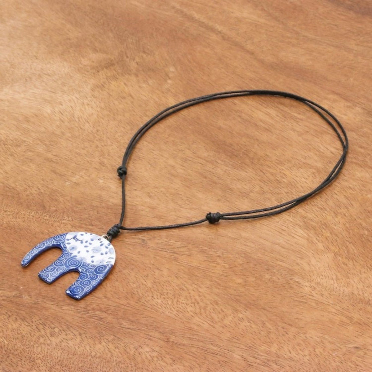 This 'Dark Floral Elephant' by Independent Artisans is a beautiful ceramic elephant pendant necklace. Designed by Napat Chotpruekchookul, the elephant is decorated with hand-painted floral motifs in dark blue and white. The pendant necklace circles the neck with an adjustable black cotton cord. The piece is a beautiful reflection of a commitment to heritage, innovation, and environmental care.