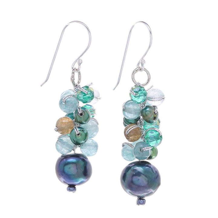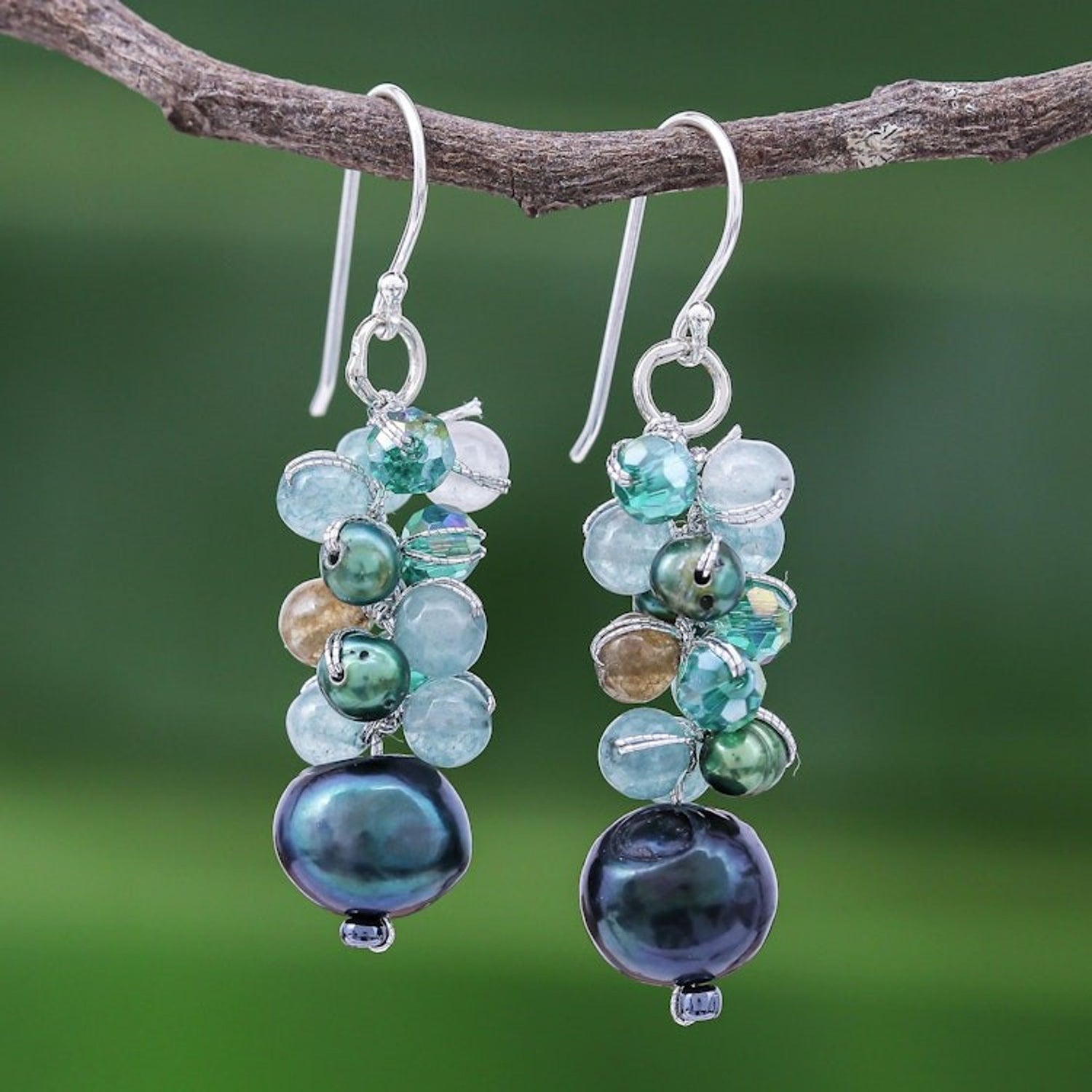 These 'Winter' by Independent Artisans are a beautiful pair of gemstone cluster dangle earrings. Designed by Nareerat, the beads are gathered on silk thread and bundled together with cultured freshwater pearls before they are set atop blue-green peacock pearls. The beads are set in complementary shades of green from polished quartz and faceted glass beads, and they are a beautiful homage to the winter season. The earrings hang on sterling silver hooks.