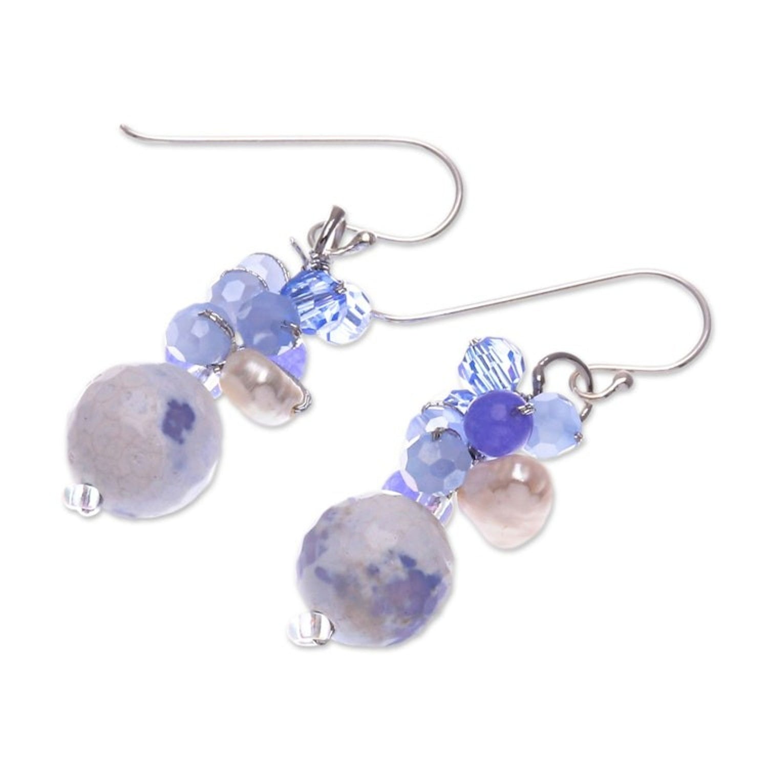 These 'Blue Energy' by Independent Artisans are a beautiful pair of multi-gemstone dangle earrings. Designed by Nareerat, joined by silk threads, the beads form a dazzling blue design with a serene aura. The accessory features faceted agate stones, quartz beads, and cultured pearls, all equipped with sterling silver hooks.