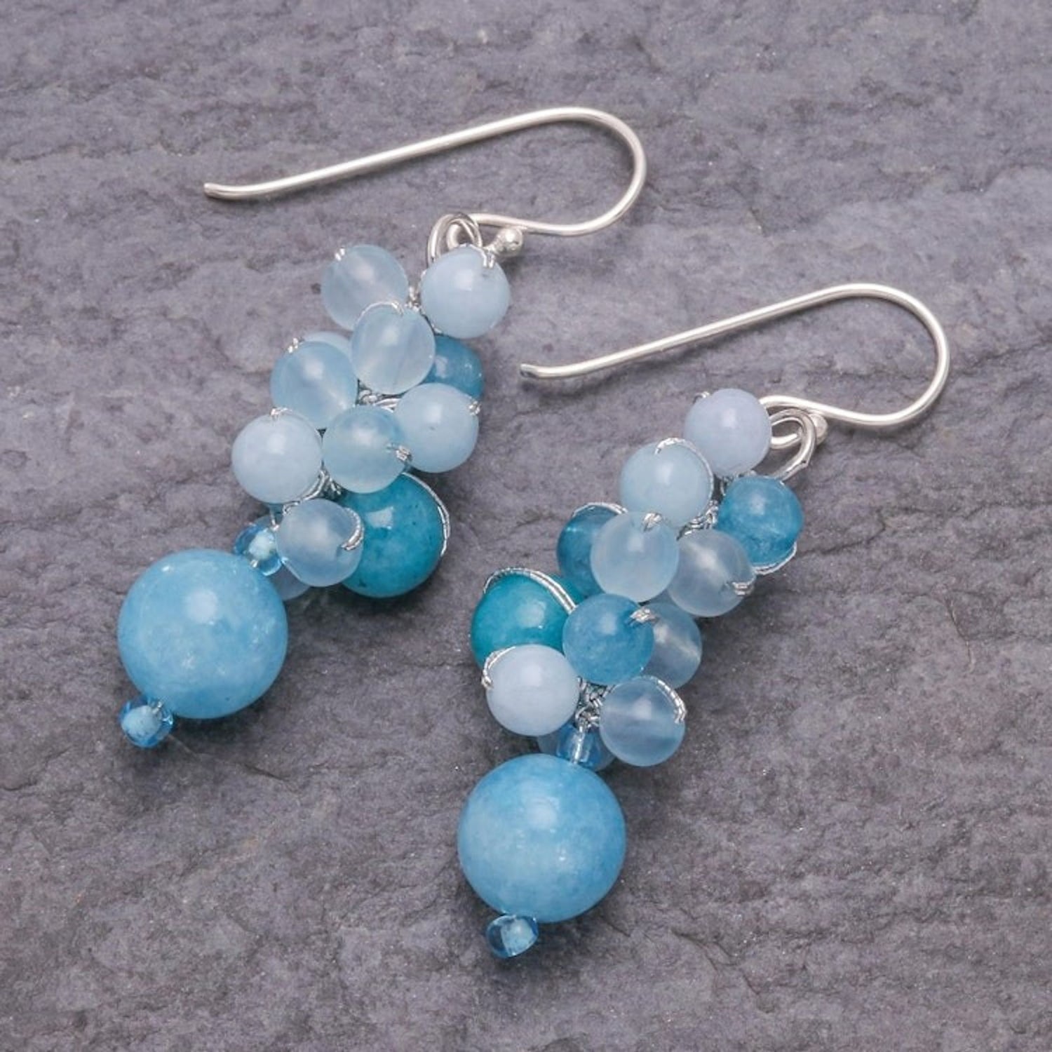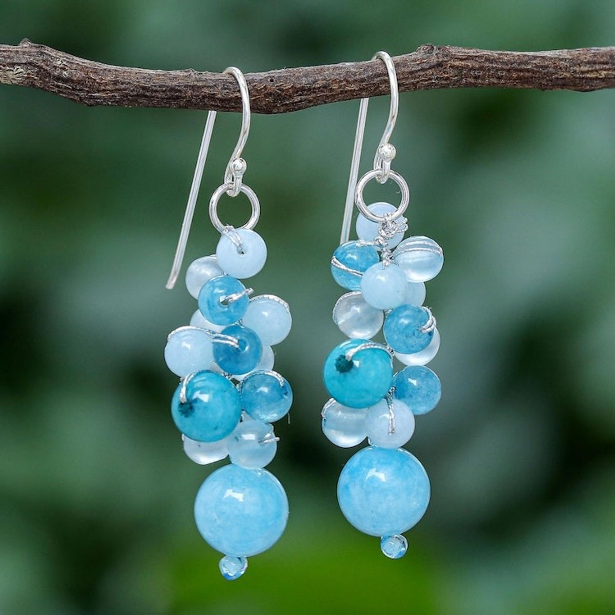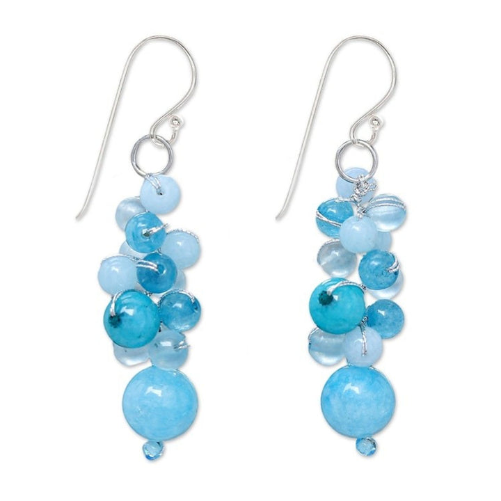 These 'Bubble Tea in Blue' by Independent Artisans are a beautiful pair of dangle earrings. Designed by Nareerat, they are bursting with gorgeous color. Using shimmering silk thread, the artisan hand wraps dyed quartz and glass beads, creating sparkling gemstone clusters that swing from sterling silver-plated brass hooks.