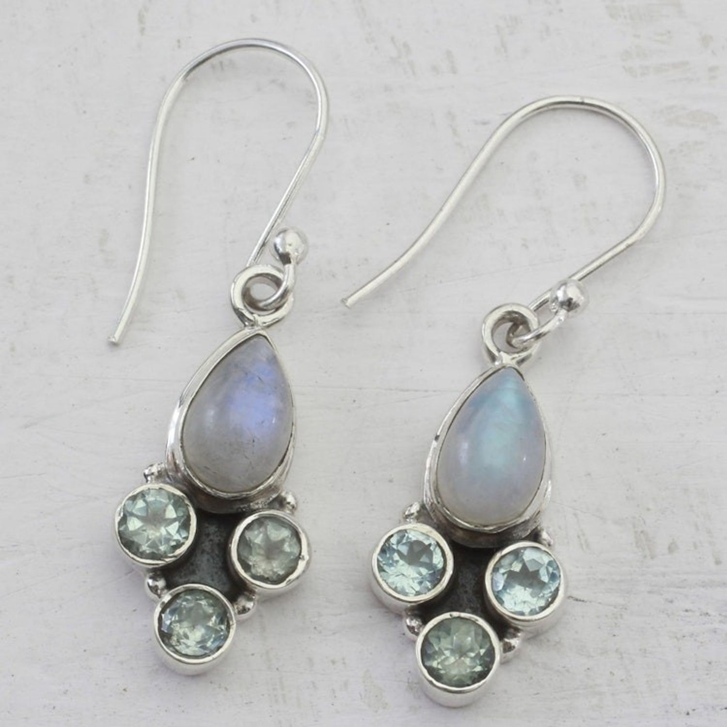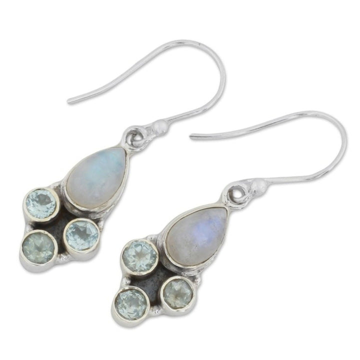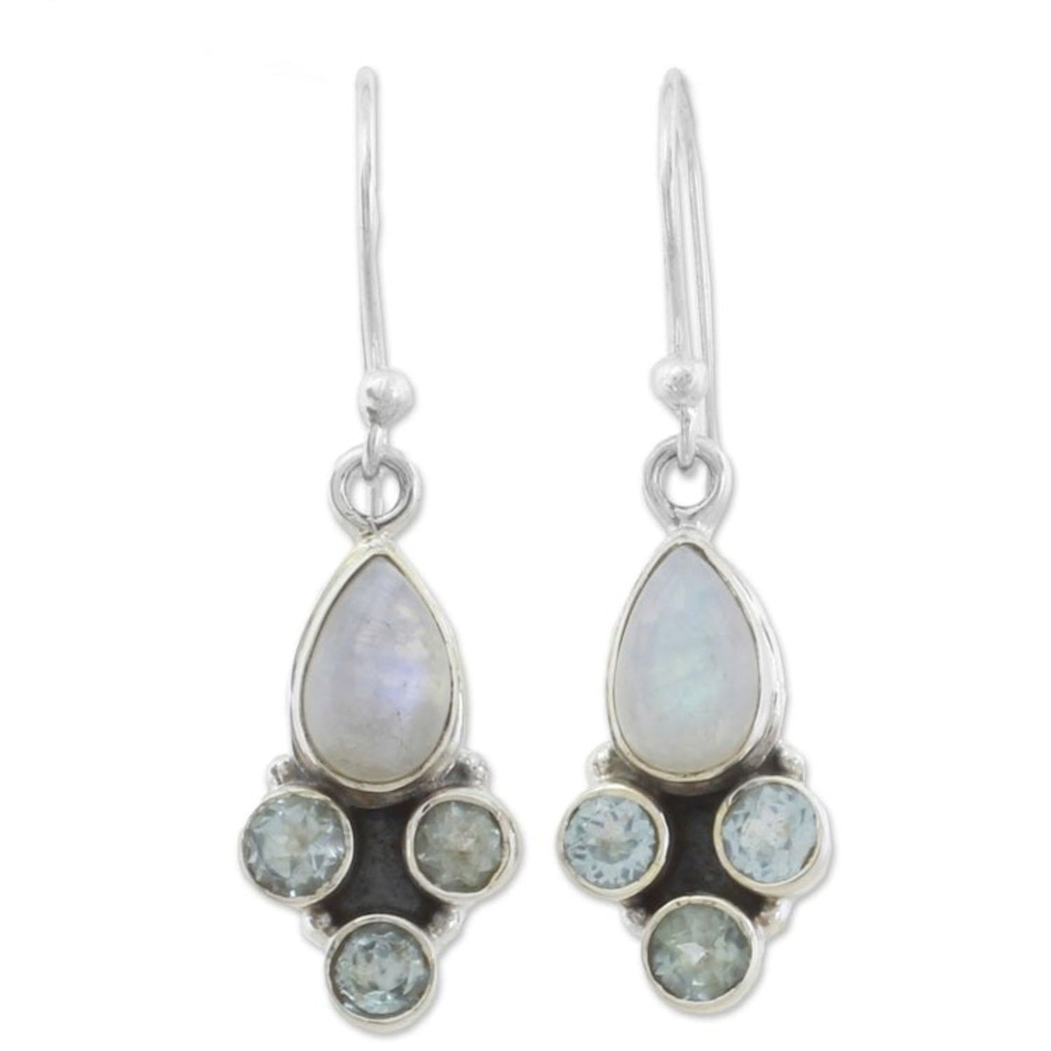 Blue Topaz and Rainbow Moonstone Dangle Earrings from India 'Enthralling Sky in Blue'