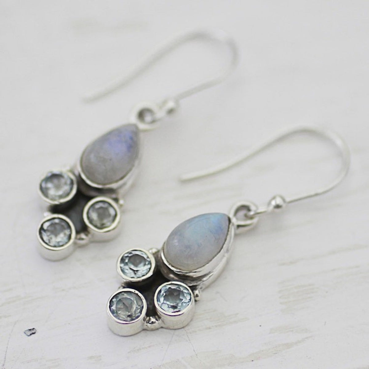 These earrings are crafted from 925 sterling silver, rainbow moonstone, and blue topaz with a combination finish. They feature hook earrings and measure 1.5 inches L x 0.4 inches W x 0.2 inches D.