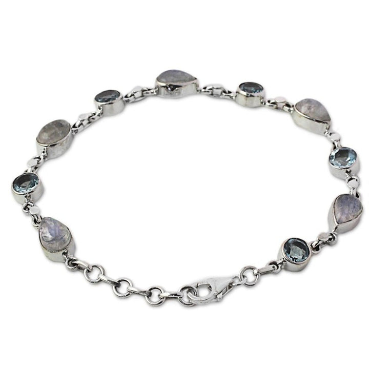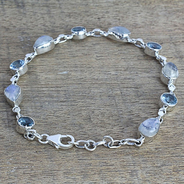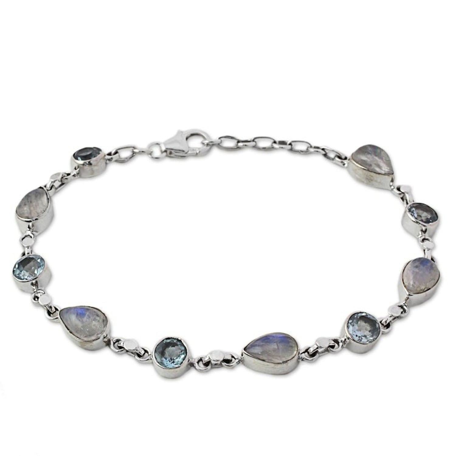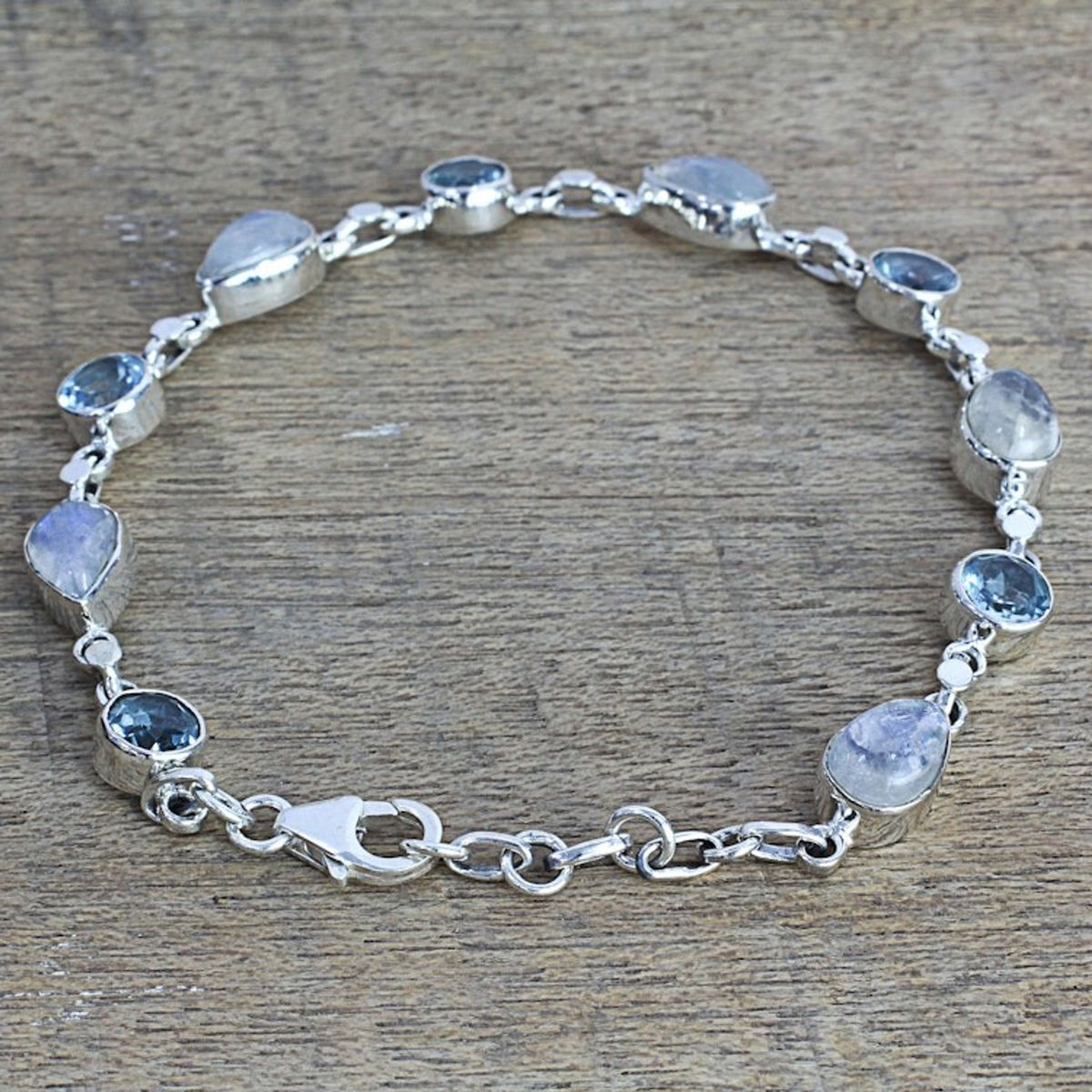 This 'Misty Sky' by Independent Artisans is a dreamy link bracelet. Presented by Shanker, it features four carats of pear-shaped blue topaz gemstones and natural rainbow moonstone cabochons connected by high-polish sterling silver links. The piece is a beautiful representation of how each design is a blend of tradition, craftsmanship, and originality.