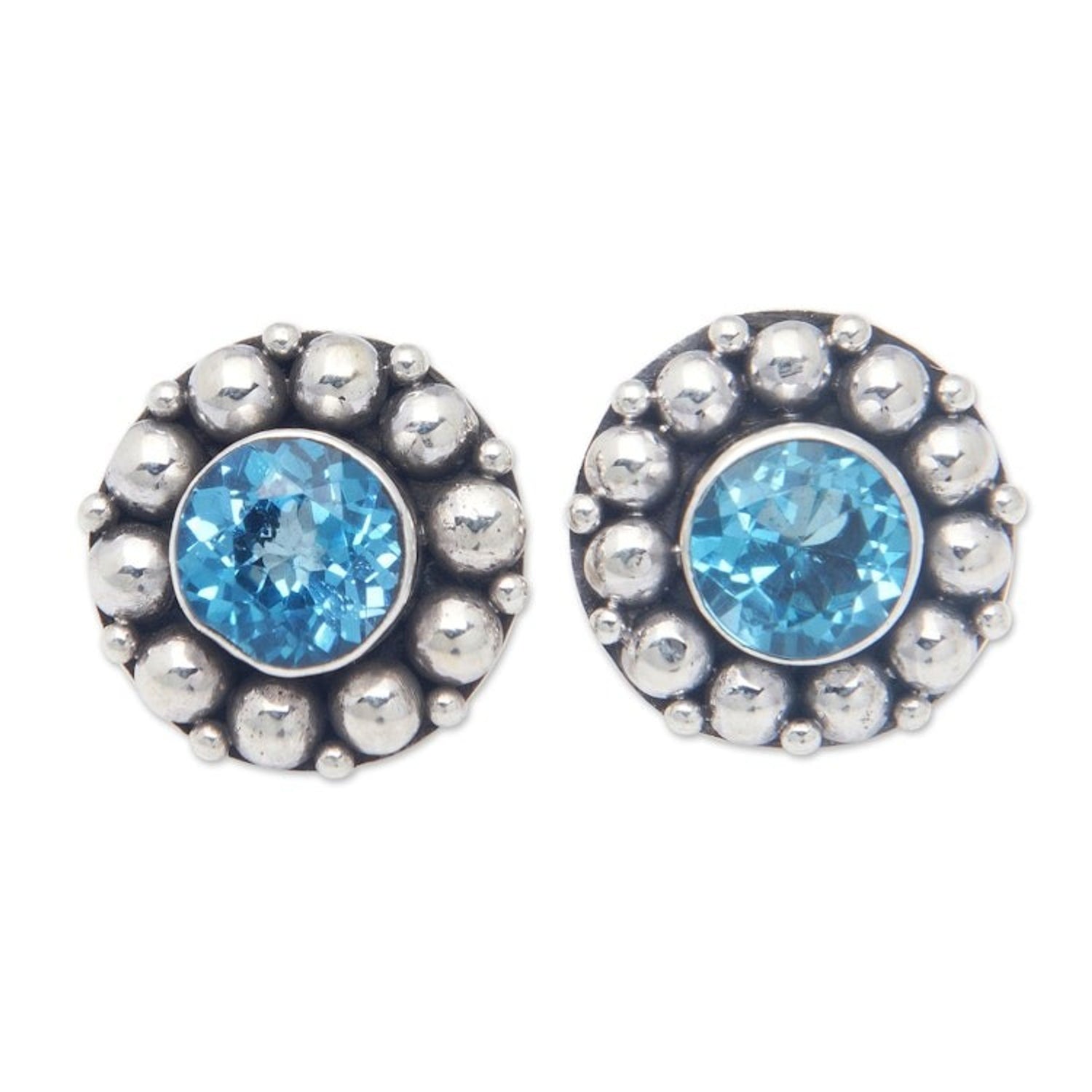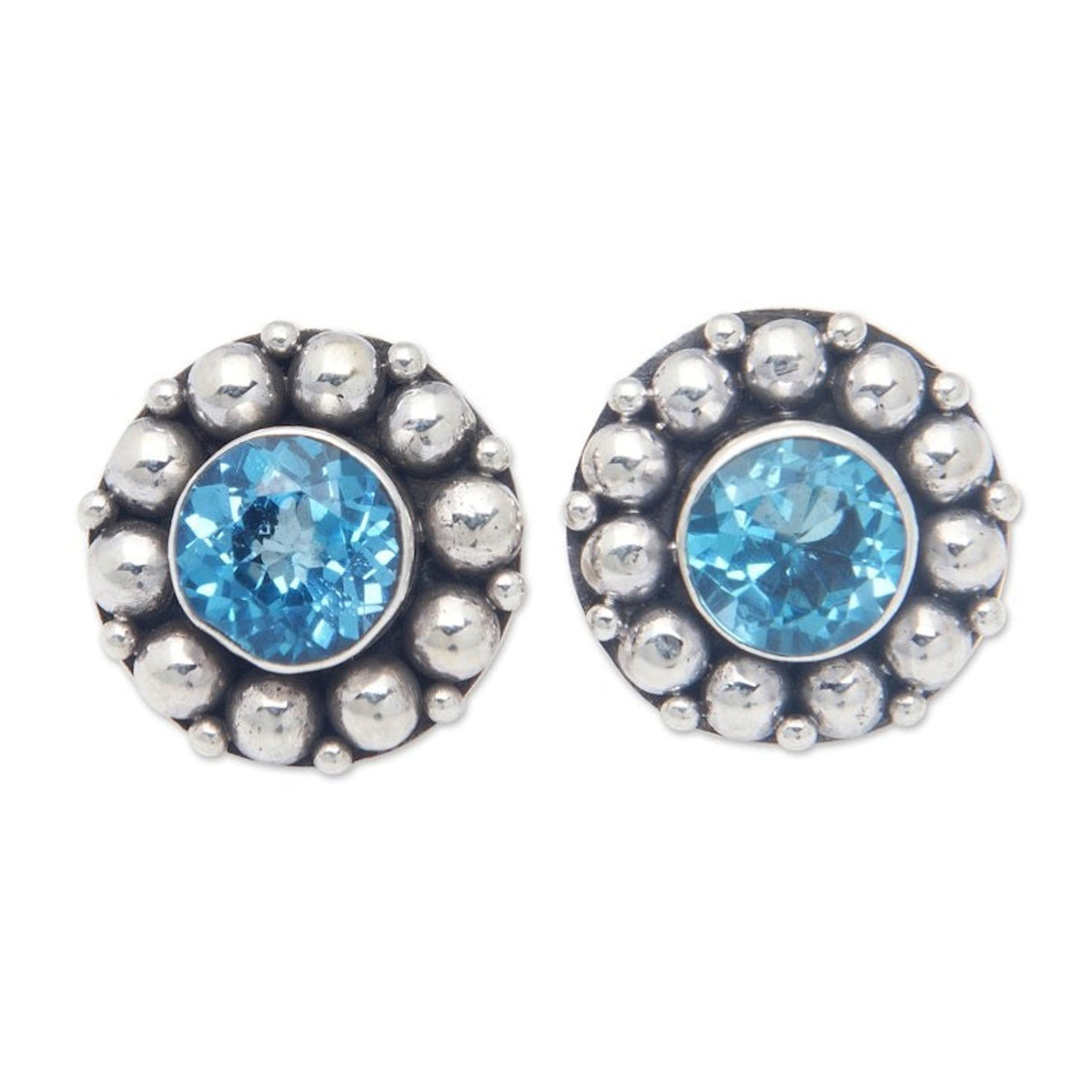 Blue Topaz Button Earrings with Sterling Silver Beads 'Azure Fancy Flower'