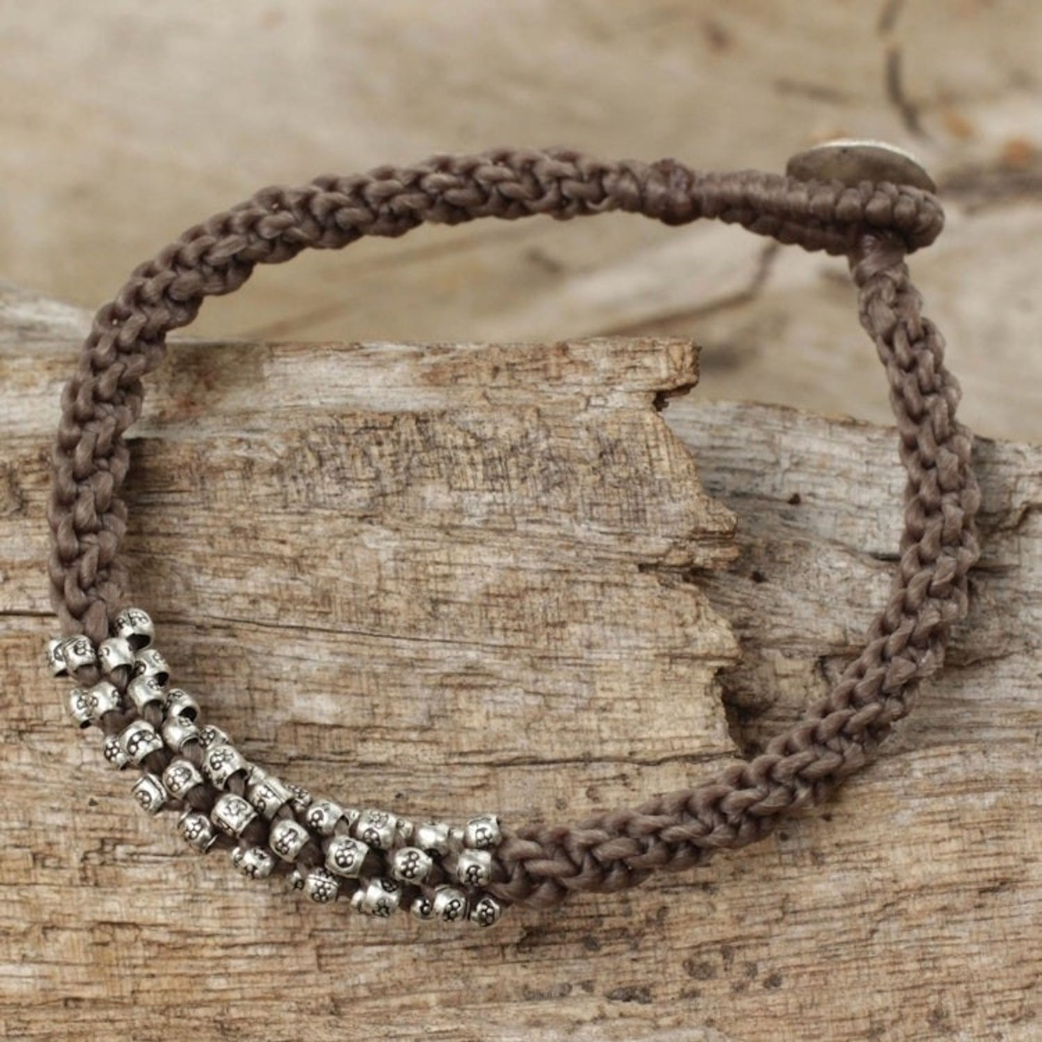 Braided Gray Cord Bracelet with Silver 950 Floral Beads 'Tribal Flowers in Taupe'