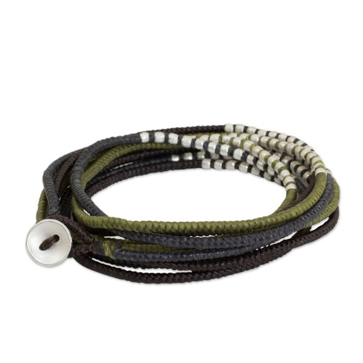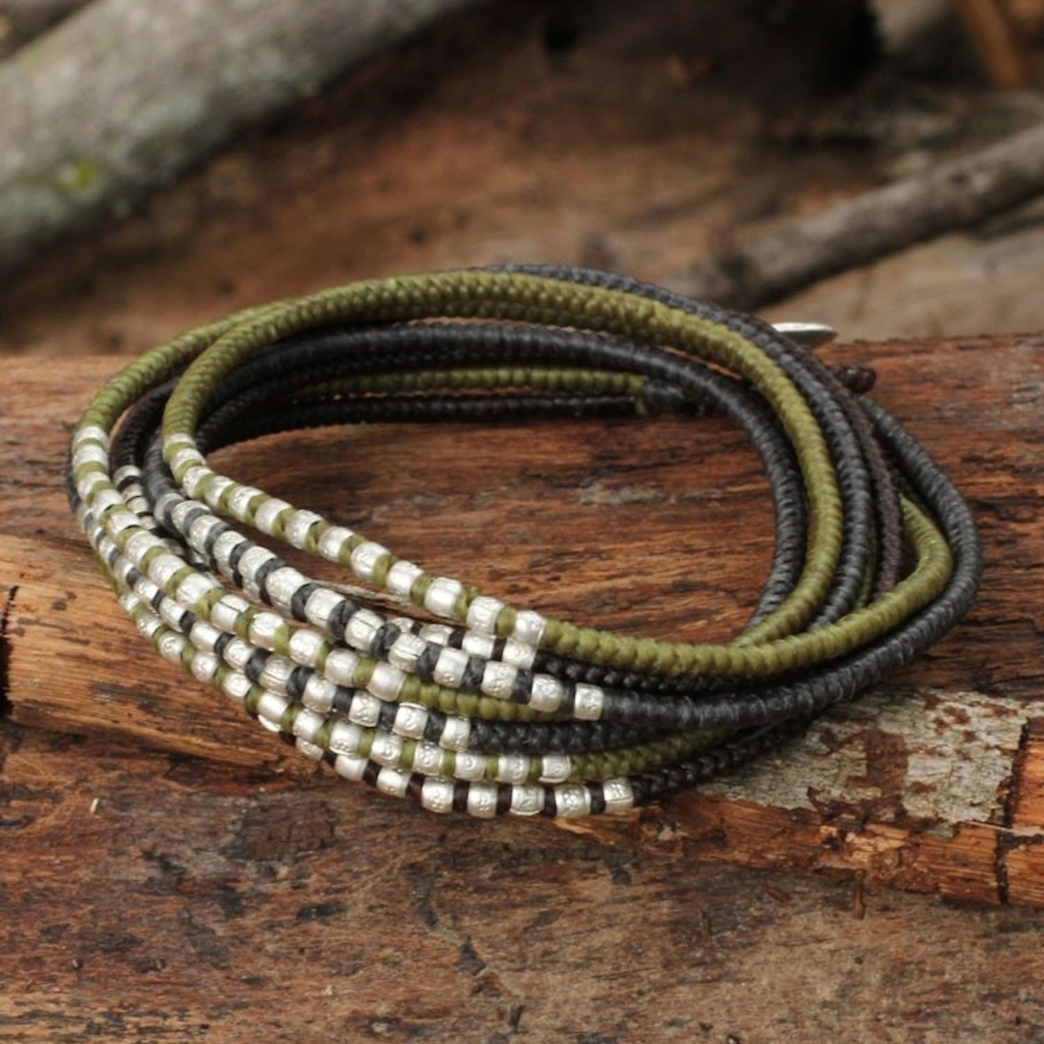 This wrap bracelet is crafted from waxed polyester cords and sterling silver-plated brass beads and clasp. It weighs 0.42 oz and measures 22 inches L by 8 mm W. It features a button clasp and a matte finish. Made in Thailand.
