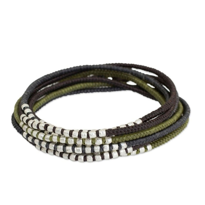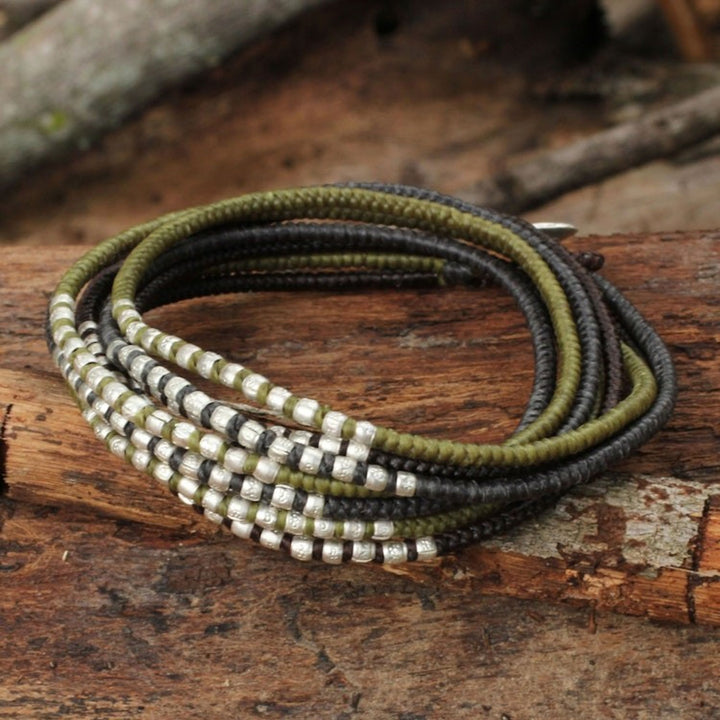 This 'Karen Khaki Chic' wrap bracelet by Independent Artisans is a chic and versatile piece that blends ethnic influences with modern bohemian flair. Thai artisan Napapat has designed this bracelet by hand-knotting three strands of brown, gray, and olive waxed polyester cords, creating a layered effect that wraps elegantly around the wrist. The cords are adorned with florid beads of sterling silver-plated brass, which are meticulously crafted by artisans from the Karen hill tribe. The contrast between the simple cords and the feminine, floral beads makes this a unique accessory perfect for adding a touch of rustic charm to any outfit.