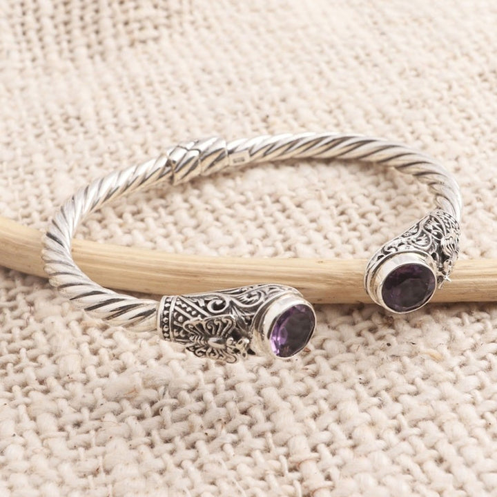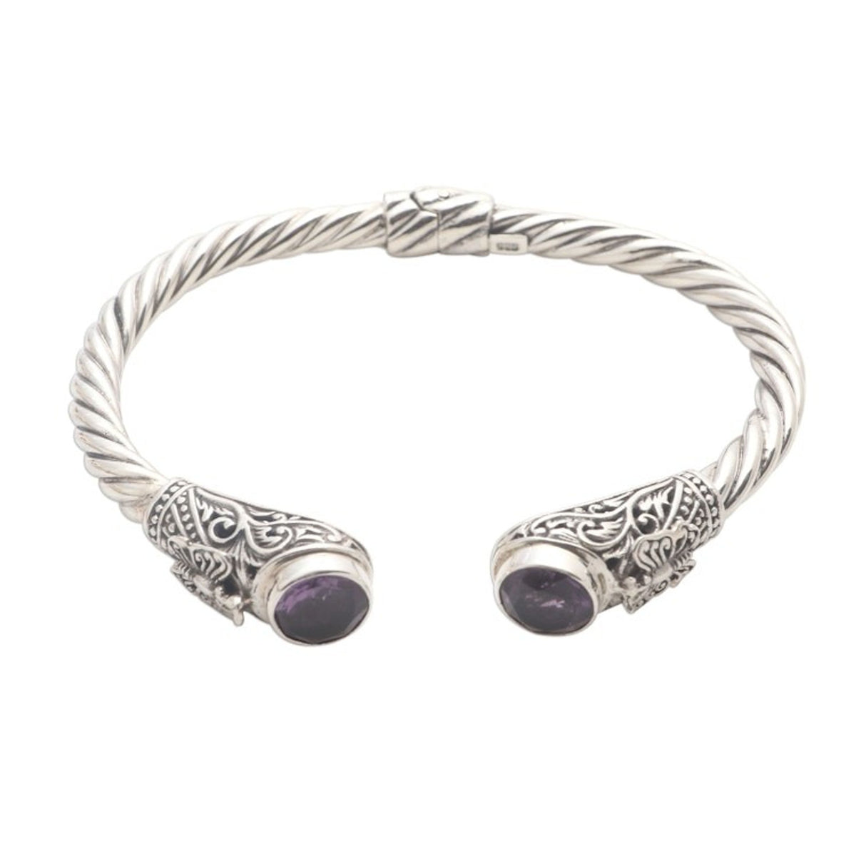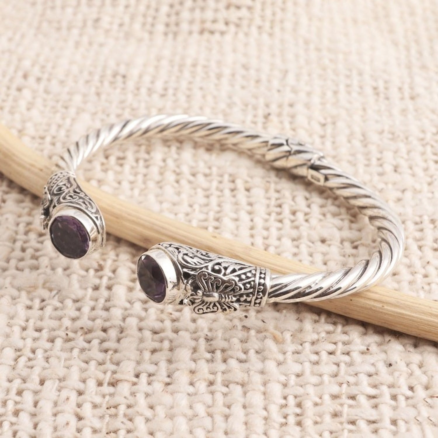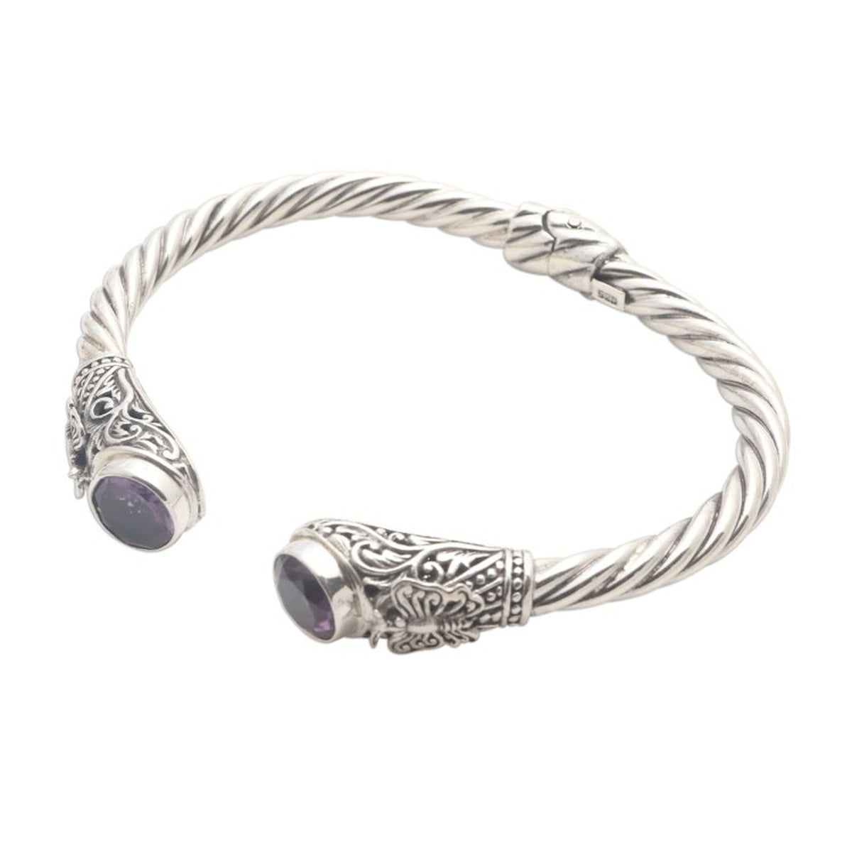 This 'Perched Butterfly' cuff bracelet by Independent Artisans is a stunning and elegant accessory that beautifully merges nature and artistry. Created by Balinese artisan Giri Tasmana, this sterling silver cuff bracelet is adorned with ornately detailed ends where graceful butterflies perch. The ends are further graced with faceted amethysts, totaling over six carats, which add a brilliant touch of color. The concealed hinge makes it easy to put on and take off, blending exquisite design with effortless wearability. This bracelet is a celebration of Indonesia’s rich flora and fauna.