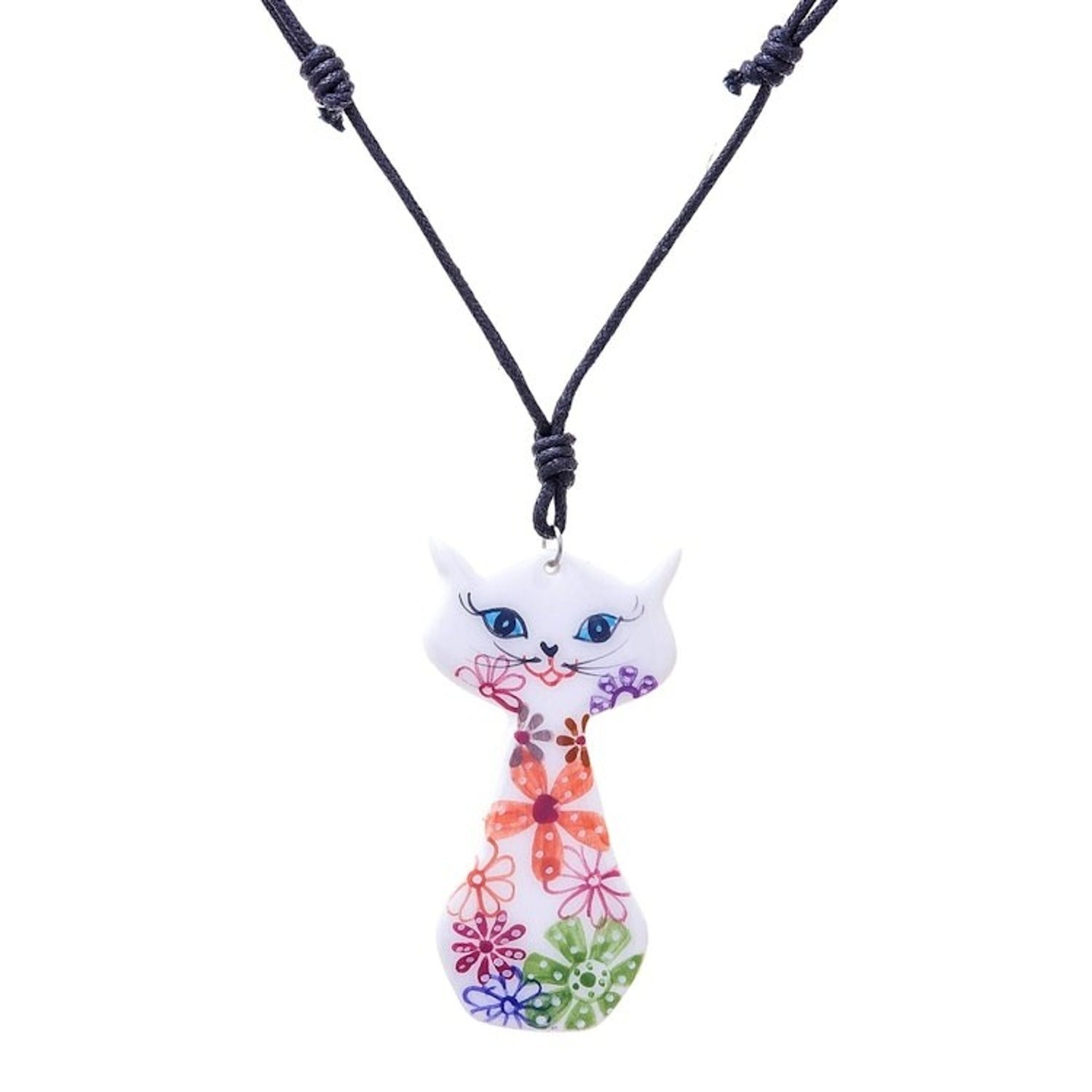 This 'Daisy Cat' ceramic floral cat pendant necklace by Independent Artisans is a charming and whimsical accessory. Designed by Thai artisan Napat Chotpruekchookul, this necklace features a cat crafted of white ceramic, which is hand-painted with colorful daisy motifs. The pendant hangs from an adjustable cotton cord. This necklace is a perfect way to express your love for cats and adds a touch of playful elegance to any outfit.