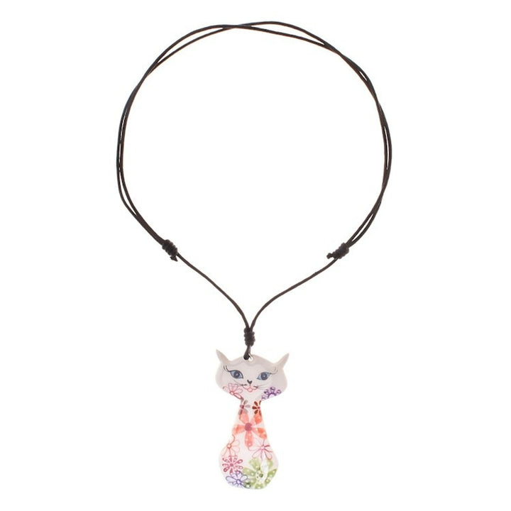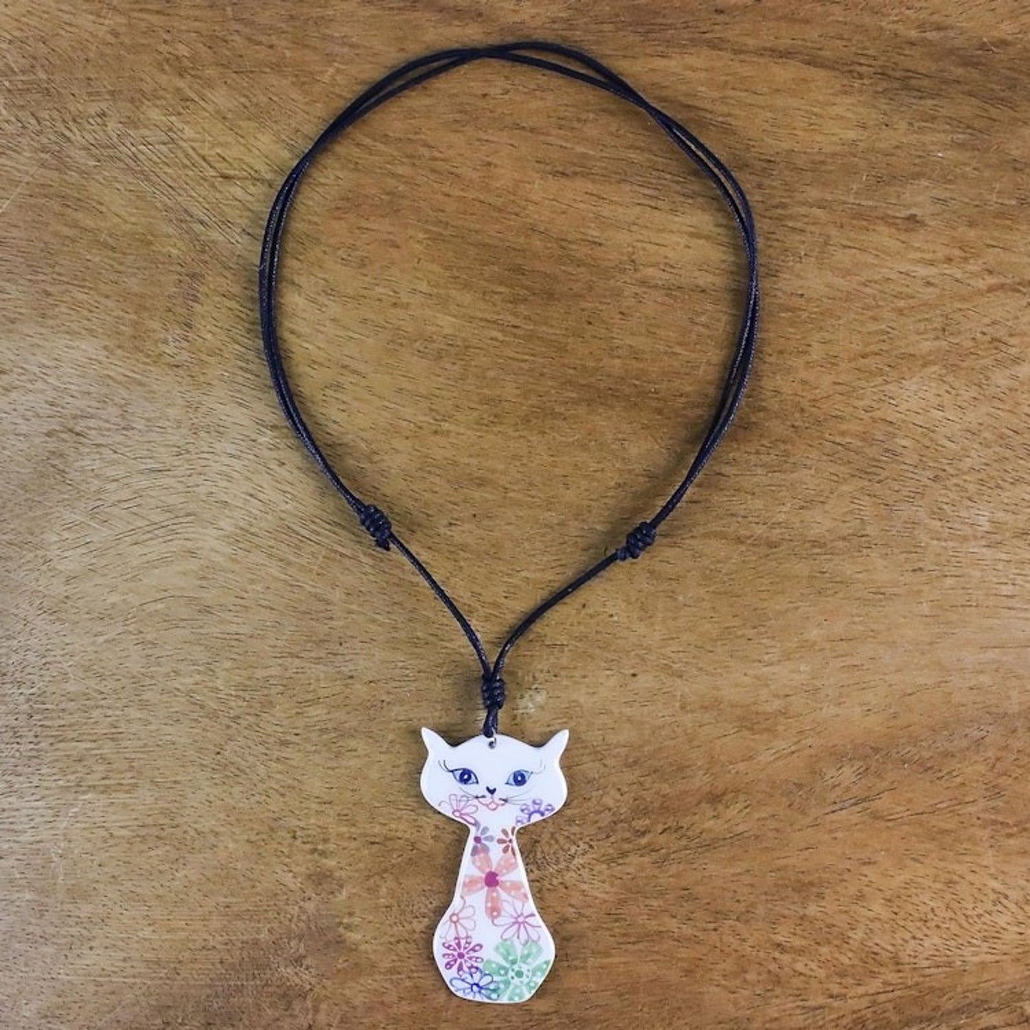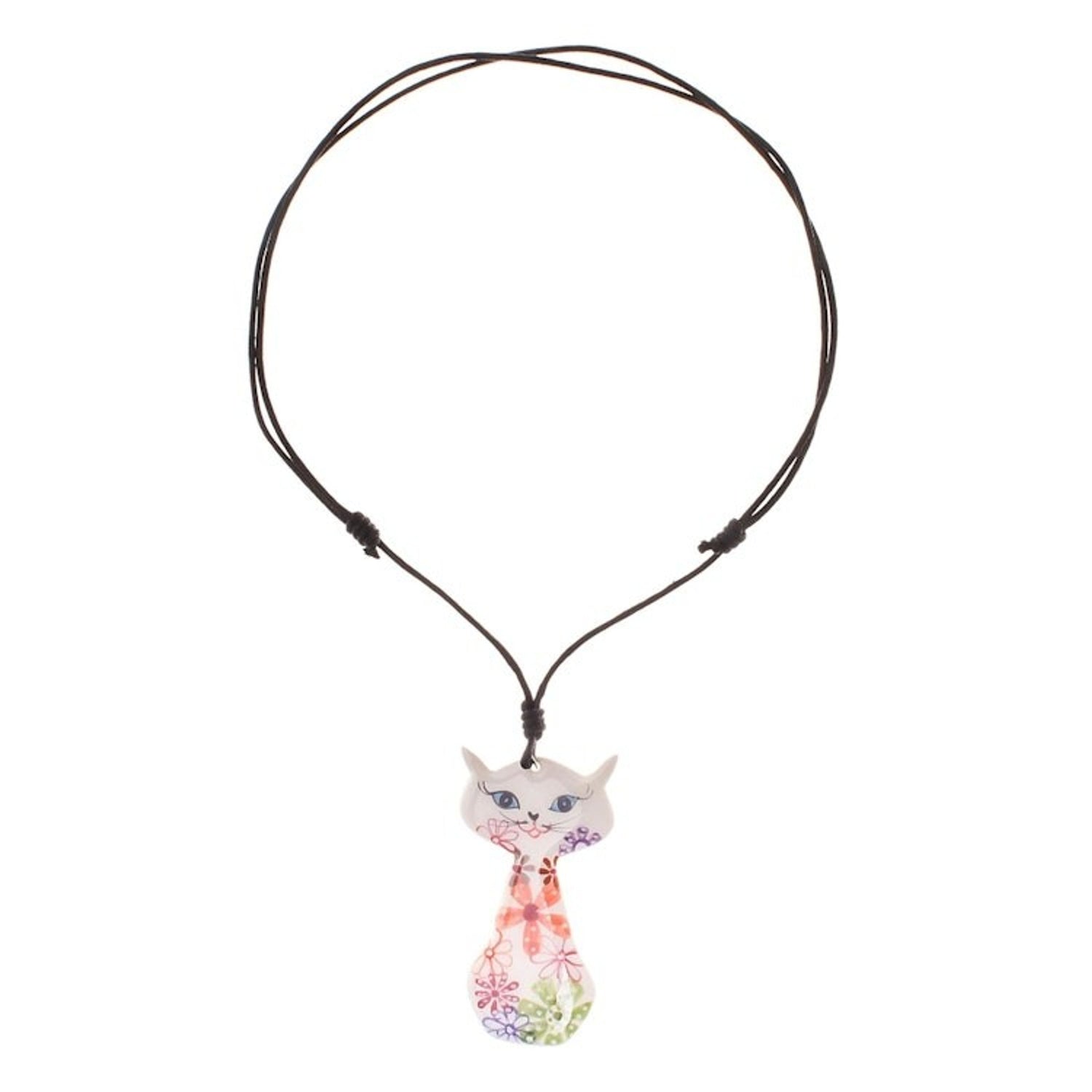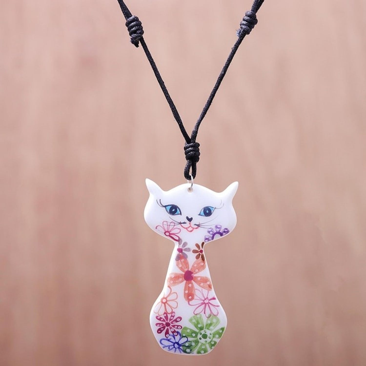 Ceramic Floral Cat Pendant Necklace from Thailand 'Daisy Cat'