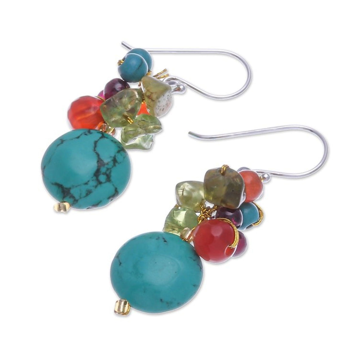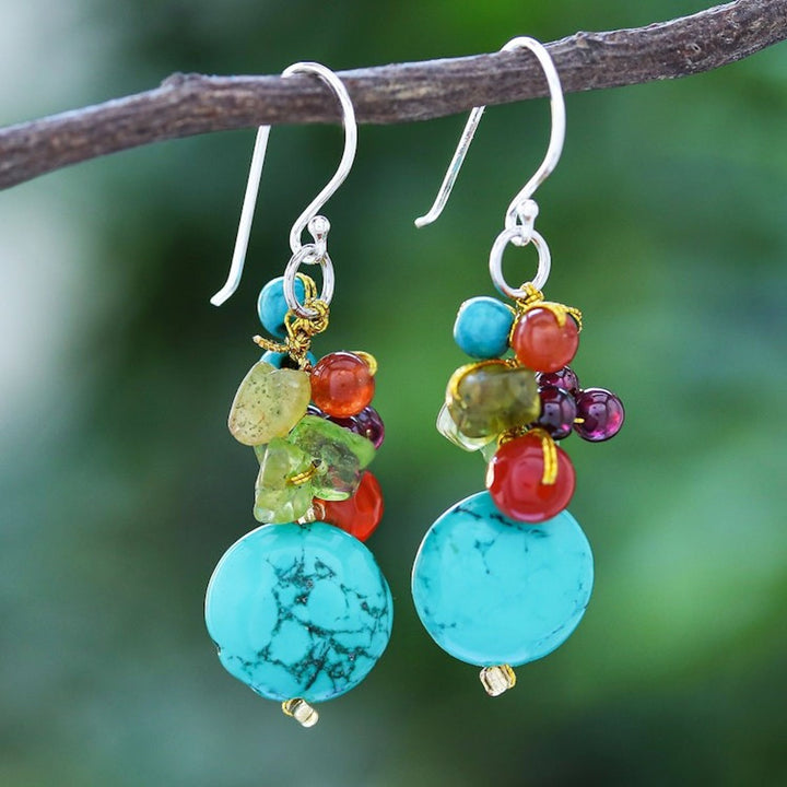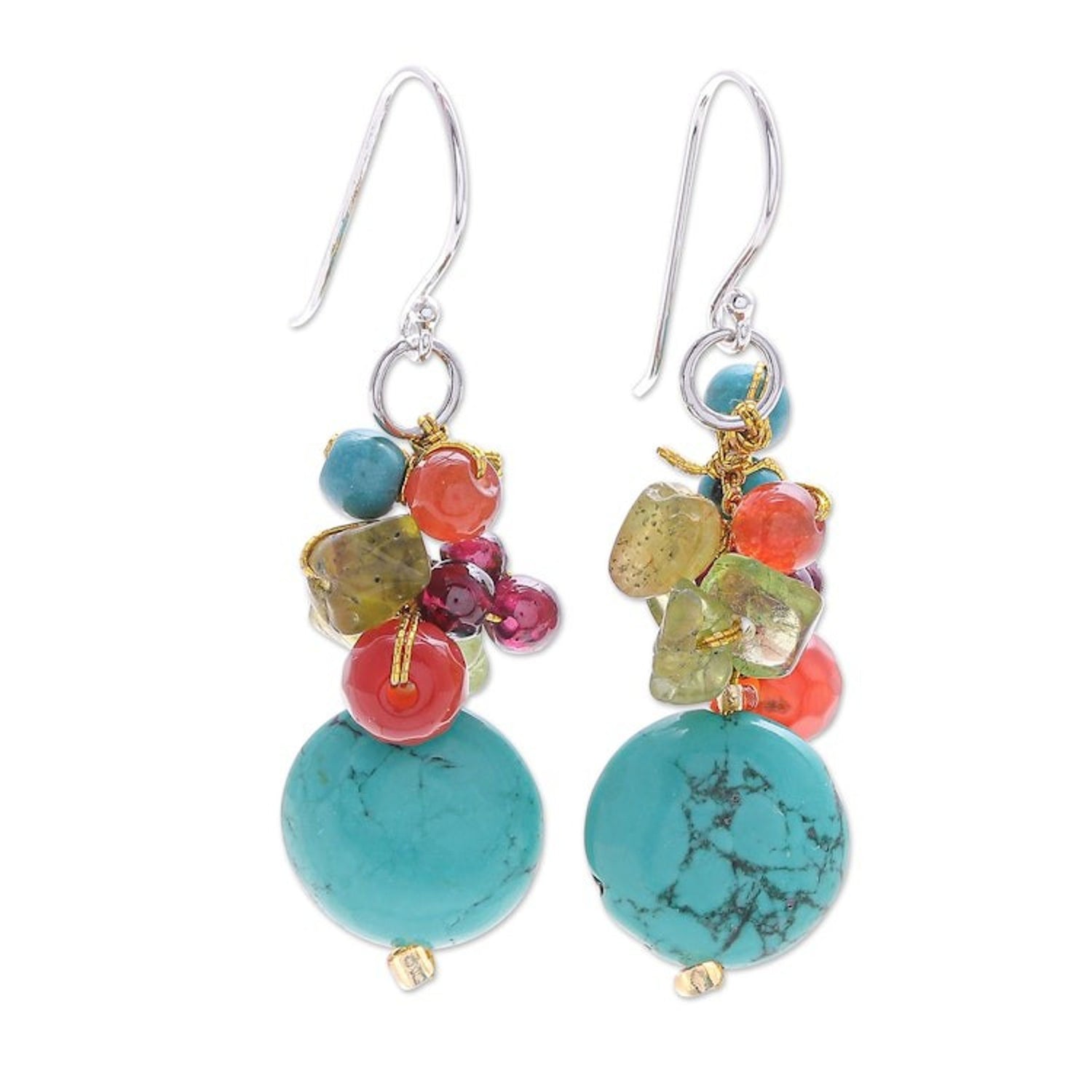 These Chalcedony and Peridot Dangle Earrings by Independent Artisans are a cheerful and vibrant accessory for a "Day Trip." Designed by a Thai artisan dedicated to preserving manual jewelry techniques, these earrings are a celebration of nature's colors. The design features beautiful howlite coins that hang from a cluster of colorful gems, including peridot chips and garnet, howlite, and chalcedony beads. The gems are hand-knotted with shimmering metallic thread, creating a charming and intricate detail. With their cool, shiny sterling silver hooks, these earrings are a playful and stylish addition to your everyday look.
