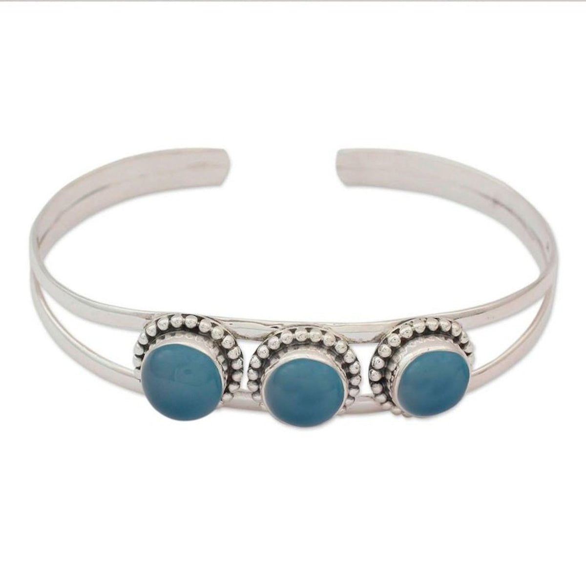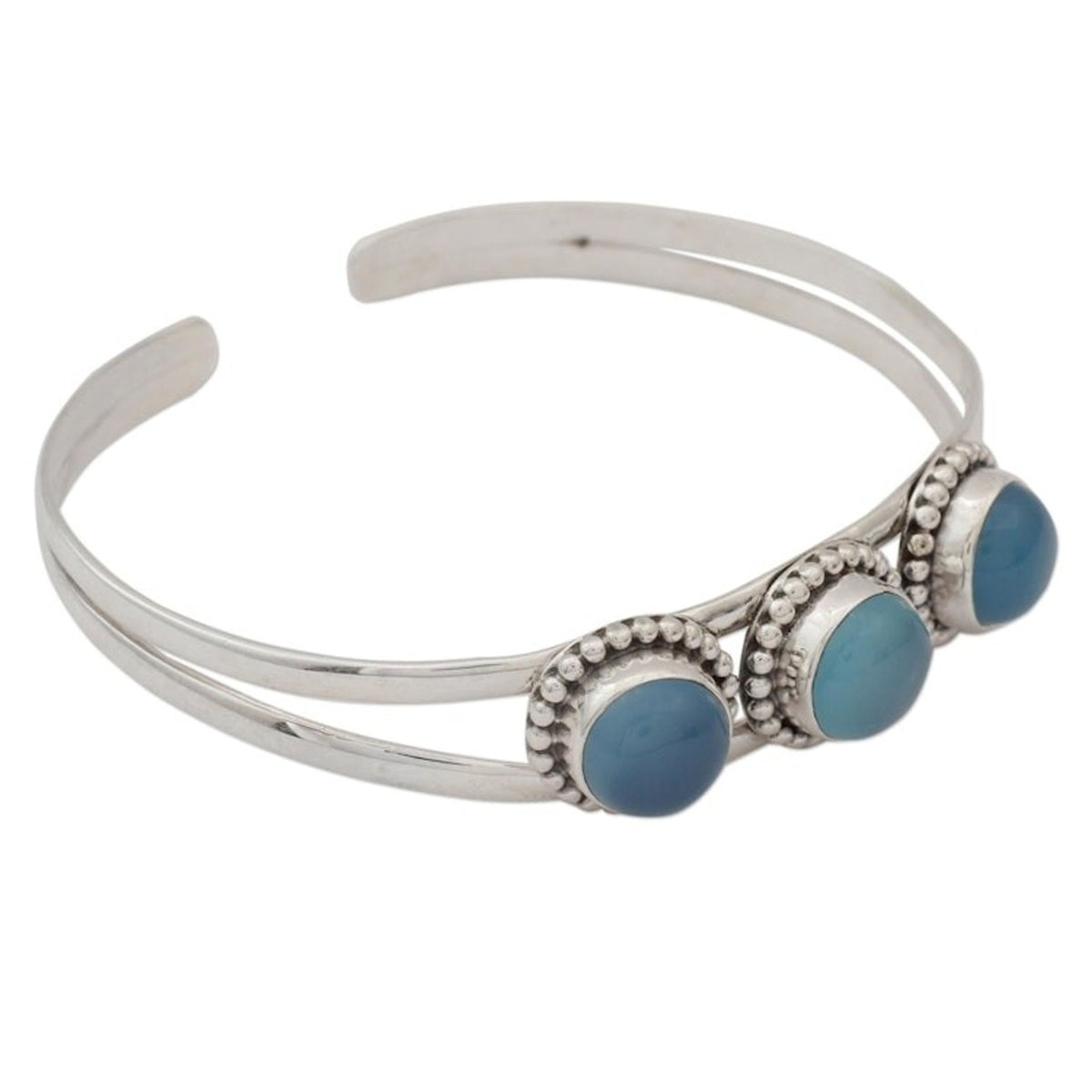 Handcrafted in India from 925 sterling silver with a combination finish, this cuff bracelet features three enhanced chalcedony gemstones. It measures 6.3 inches L x 0.5 inches W.