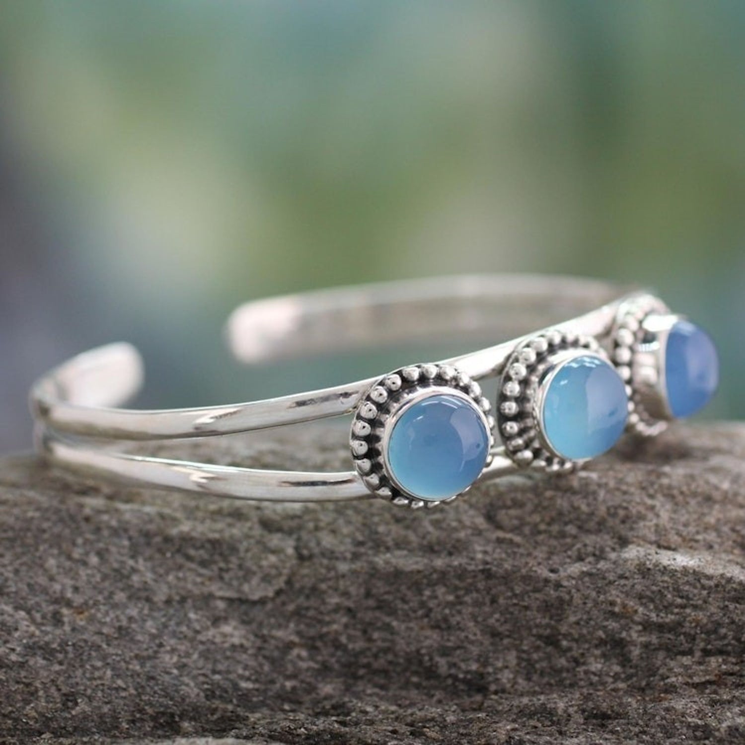 This Chalcedony cuff bracelet by Independent Artisans is a delightful piece of wearable art. Designed by Neeru Goel, who transformed her lifelong passion for jewelry into a career, this cuff bracelet glows with azure elegance. Three captivating blue chalcedonies are masterfully set in a sterling silver cuff that is expertly crafted by hand. The design is a beautiful reflection of the artist's dedication and curiosity, blending traditional Indian techniques with a modern, refined aesthetic. It is a bold yet elegant statement piece, perfect for adding a pop of color and sophistication to any ensemble.