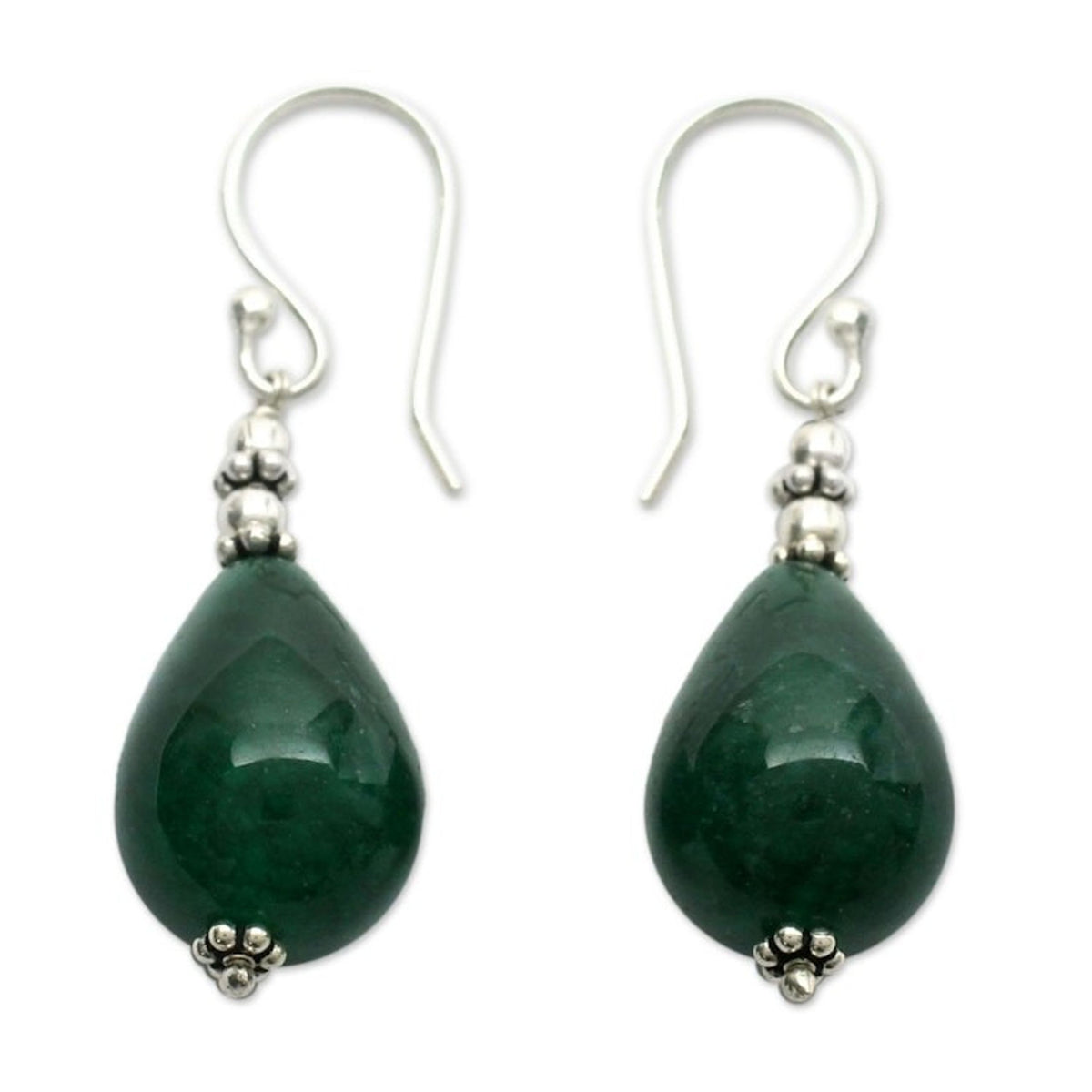 These Chalcedony dangle earrings by Independent Artisans are an original and elegant design, with a sleek, emerald green "dewdrop" of polished chalcedony. Created by Narayani, a designer who found her creative calling later in life, these earrings reflect her innate elegance and passion for artistry. The design is simple yet striking, with the smooth chalcedony gracefully suspended from sterling silver hooks. This piece is a testament to the idea that it is never too late to uncover one’s true passion, and it carries the intimate spirit of family and tradition.