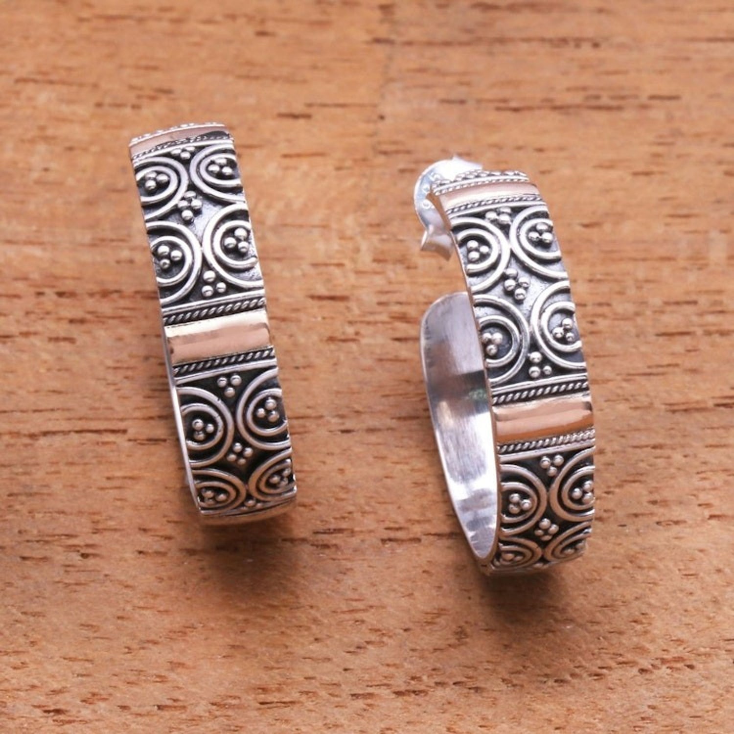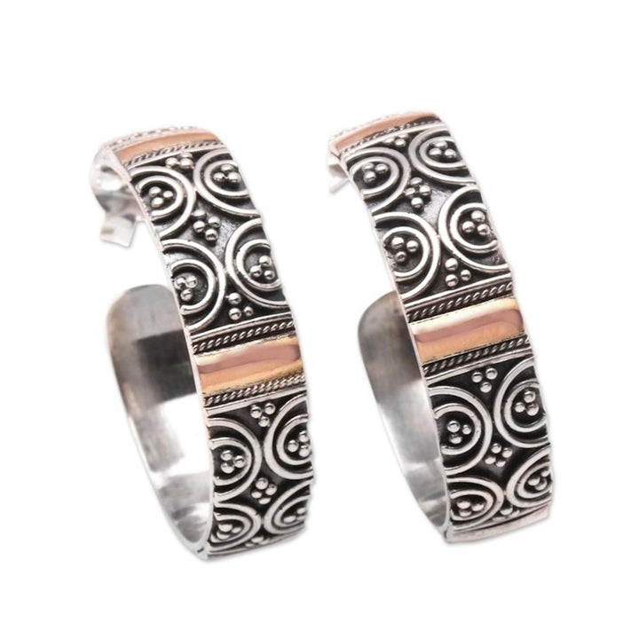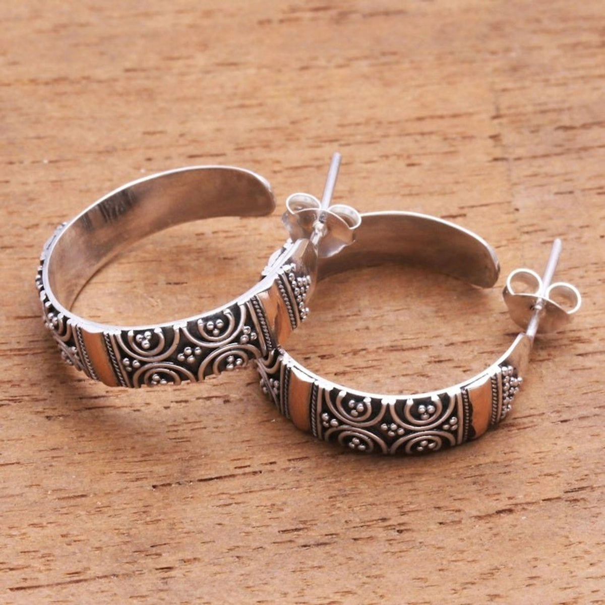 These Circle Motif Gold Accented Sterling Silver Earrings by Independent Artisans feature "Looping Semicircles" with timeless elegance. Designed by Balinese artisan Nyoman Sukartini, these half-hoop earrings honor Bali's cultural beauty by incorporating traditional bun dot work into a modern design. The handcrafted sterling silver is accented with luxurious 18k gold details, creating a beautiful contrast and a touch of sophistication. Each piece reflects the artisan's heritage and creativity, offering a connection to Bali's rich artistic traditions.