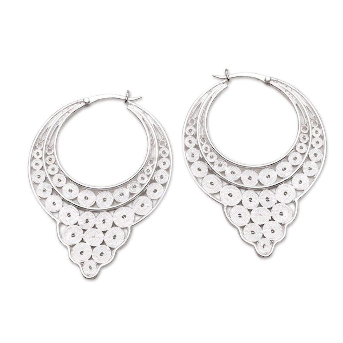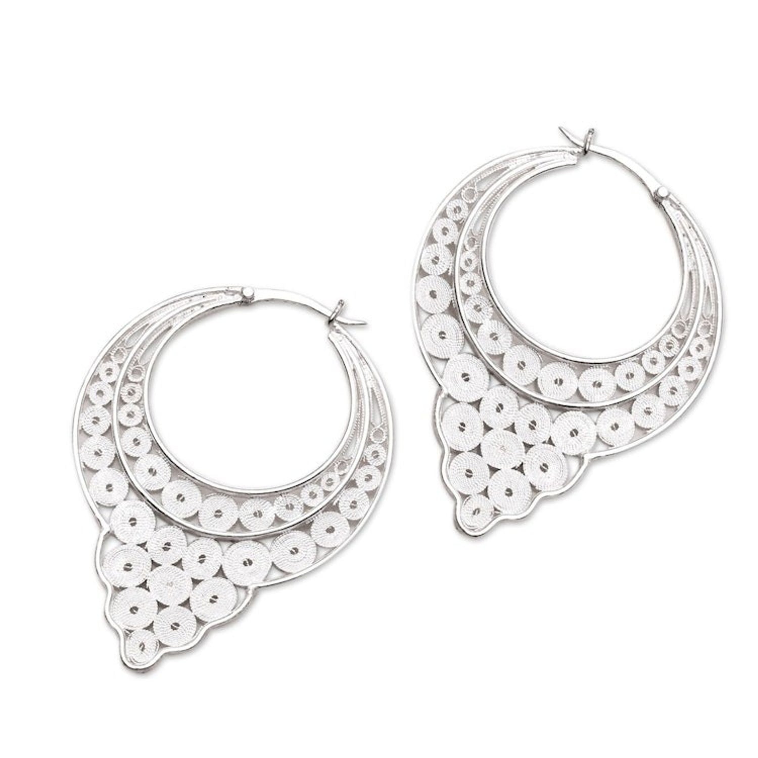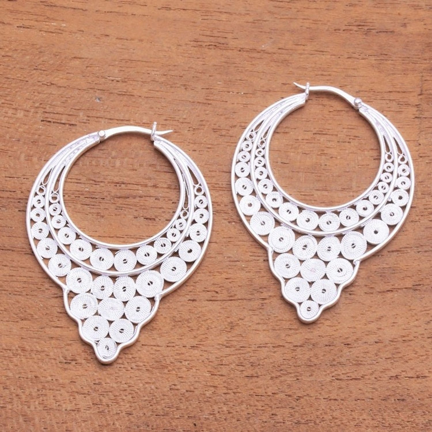 These Circle Pattern Sterling Silver Filigree Hoop Earrings by Independent Artisans feature "Intricate Circles" that create a "Wonderful Arrangement." Designed by Selly Sagita, a self-taught Javanese artisan, these drop-style hoop earrings embody her philosophy of "Contemporary by Tradition." The piece is meticulously crafted by hand from fine sterling silver filigree, weaving delicate strands into an airy, detailed design. These earrings are a beautiful blend of timeless Indonesian artistry and modern wearability, reflecting the artist's determination and perseverance.
