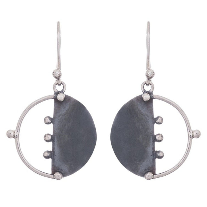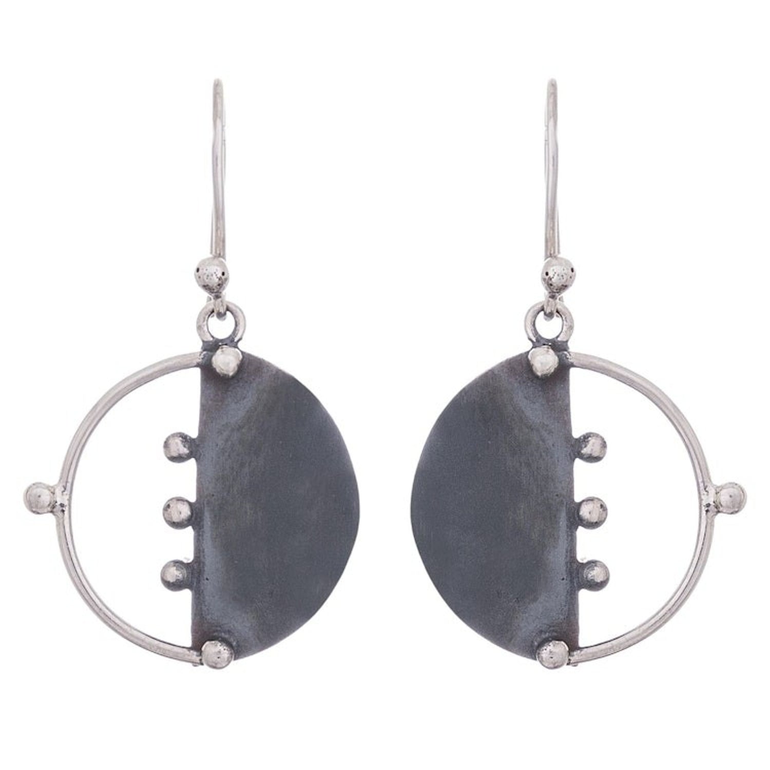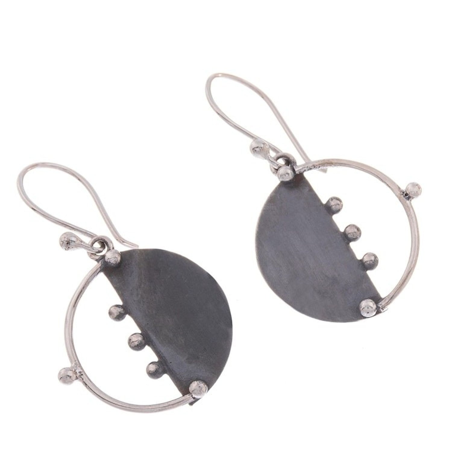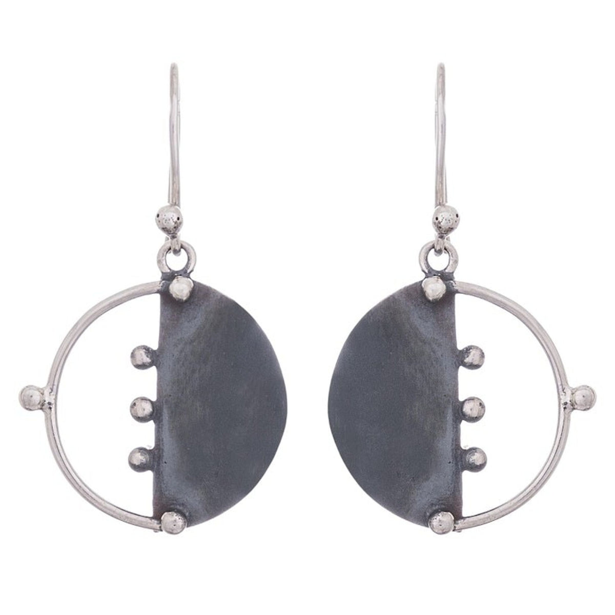 These Circular Modern Sterling Silver Dangle Earrings by Independent Artisans evoke a "Modern Cosmos" with their celestial-inspired design. Created by Peruvian artisan Diana Arana, who draws inspiration from nature's beauty and architectural motifs, these dangle earrings resemble cosmic forms. Crafted from sterling silver, their design is inspired by the phases of the moon, with a combination of finishes accentuating the shapes. This elegant accessory is a reflection of the artist's resilience and her enduring admiration for the natural and cultural landscapes of Peru.