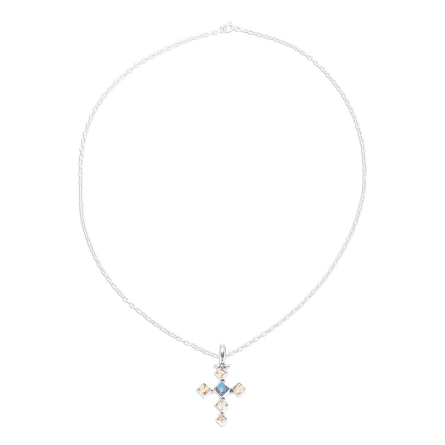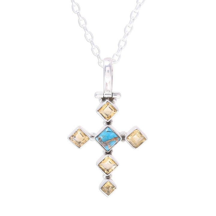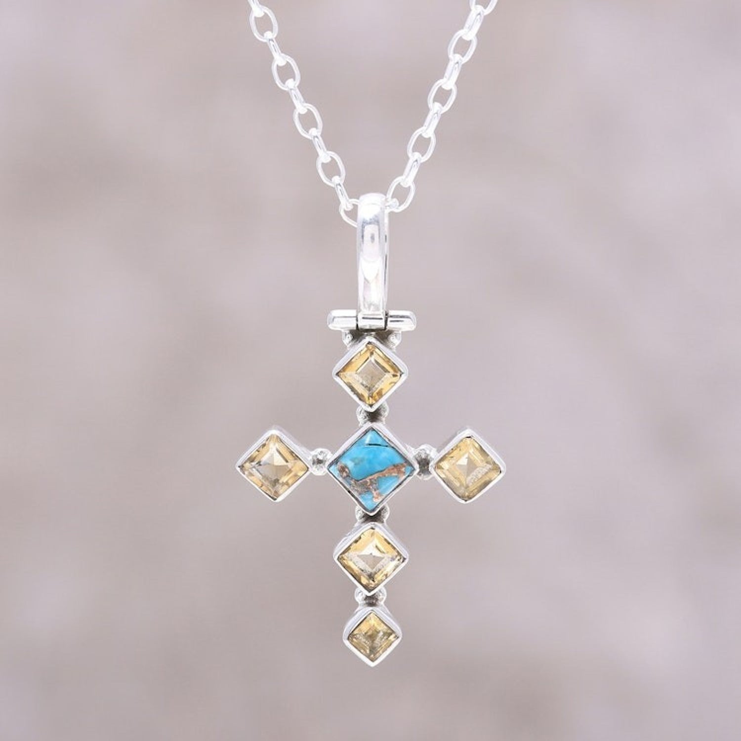 This Citrine and Composite Turquoise Cross Pendant Necklace by Independent Artisans is a lovely piece with a "Sunny Cross" motif. Designed by Shanker, who turned his interest in design into a career, this handcrafted necklace features a cross pendant. Five faceted citrine gemstones, twinkling like golden sunshine, surround a square of composite turquoise. The stones are set in sterling silver, creating a piece that is both spiritual and beautiful. Each piece represents the artist's perseverance, tradition, and passion for his craft.