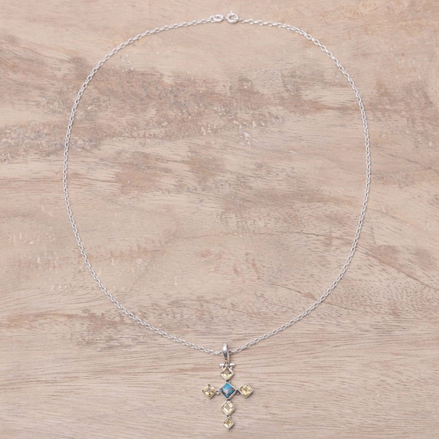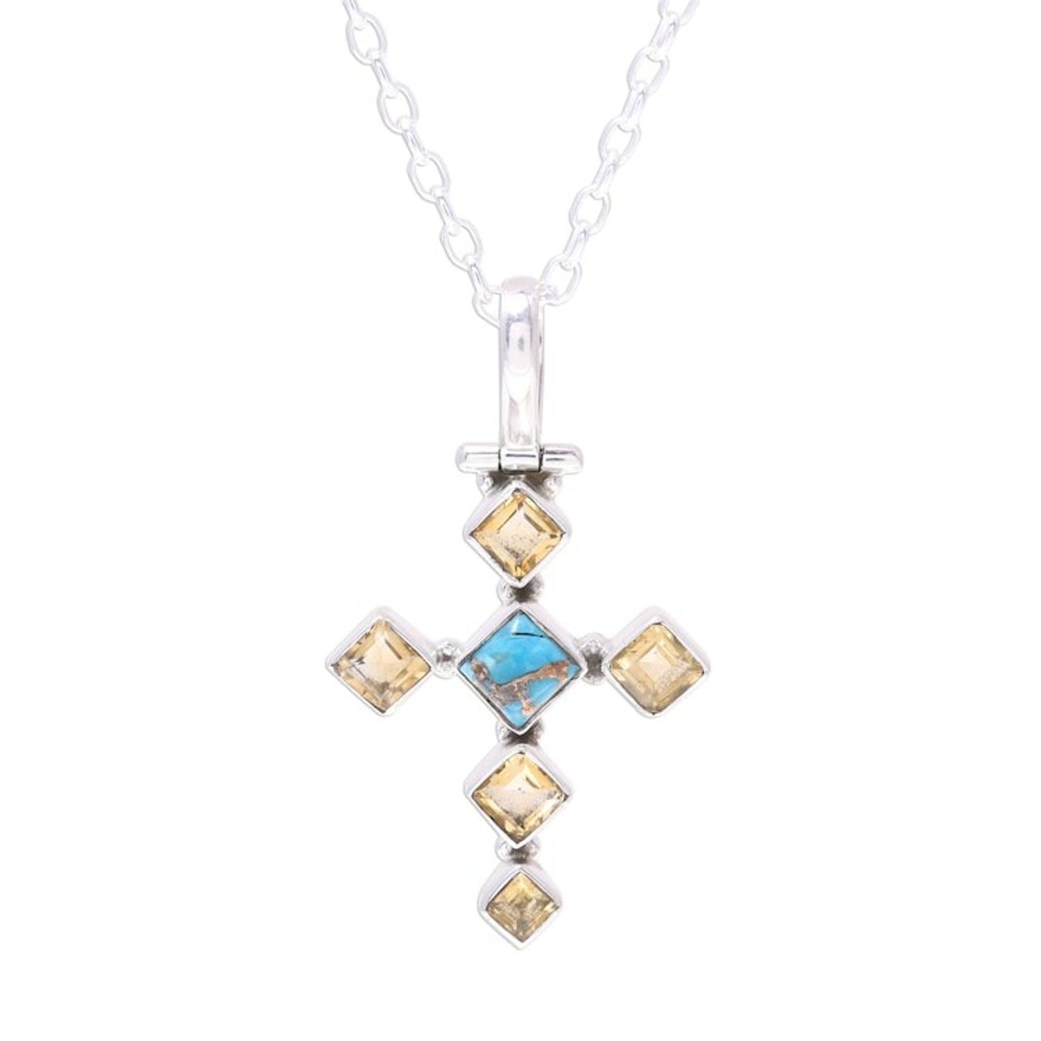 Handcrafted in India from 925 sterling silver with a combination finish, this necklace features a cross pendant with composite turquoise and citrine gemstones. It has an 18-inch cable chain with a spring-ring clasp. The pendant measures 1.5 inches L x 0.8 inches W x 0.2 inches D.