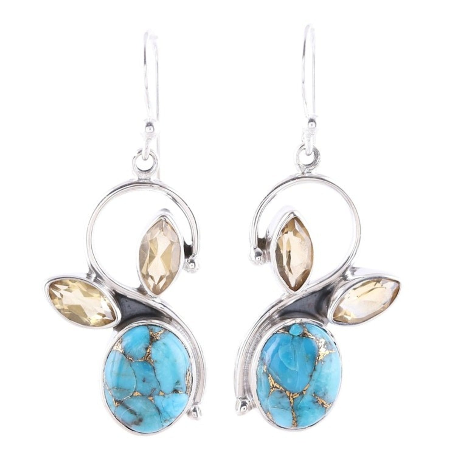 These Citrine and Composite Turquoise Dangle Earrings, 'Dazzling Sparkle,' are an elegant and striking accessory. Presented by Indian designer Shanker, who is celebrated for his craftsmanship and artistry, this pair of earrings features four marquise-cut citrine gems totaling two carats. Two oval cabochons of composite turquoise are set below, beautifully complementing the golden sparkle of the citrines. The combination of these two stones in a sterling silver setting creates a dazzling and sophisticated piece.
