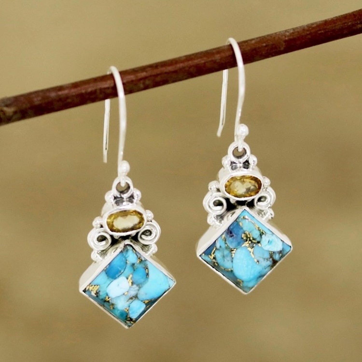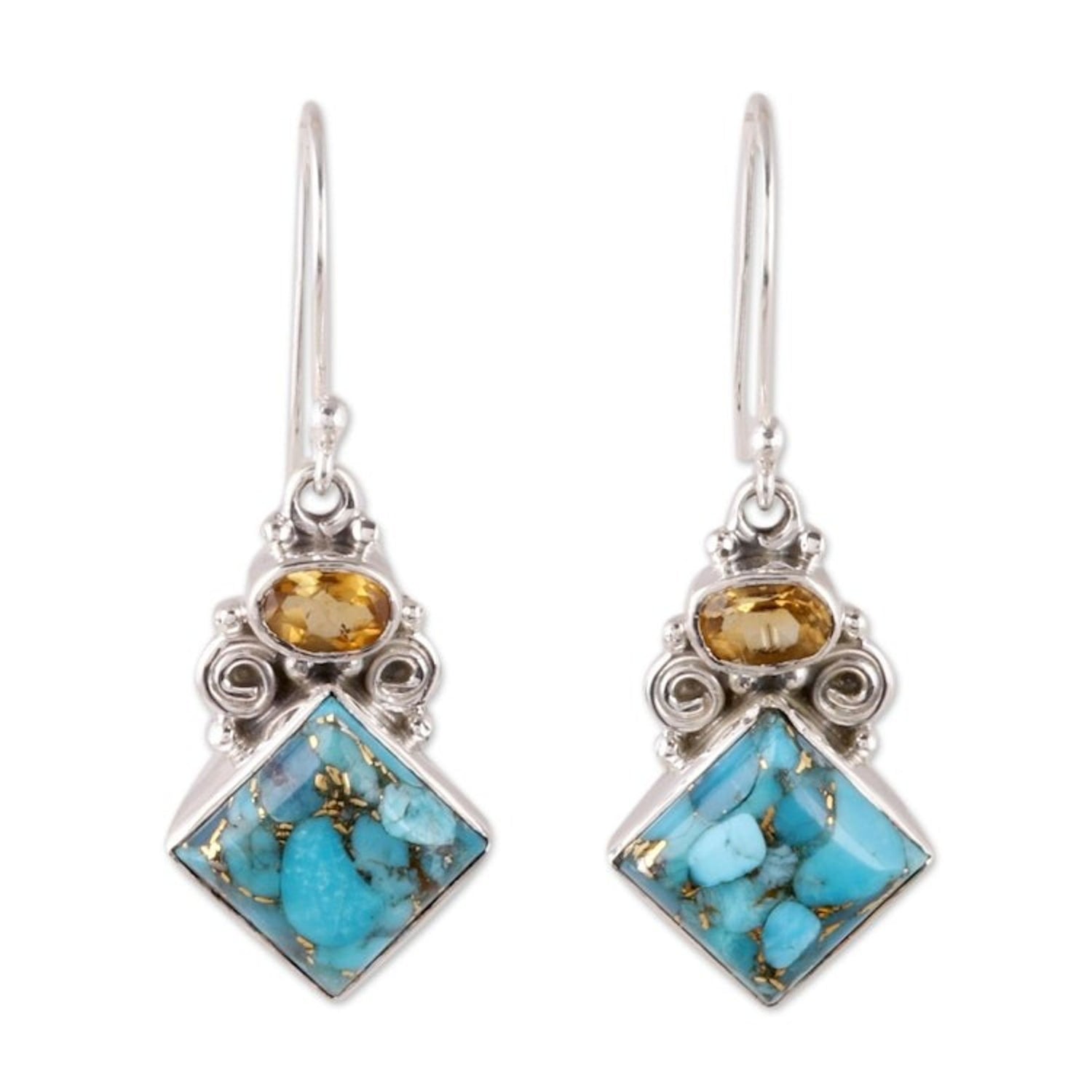 Citrine and Composite Turquoise Dangle Earrings from India 'Sky Fragments'