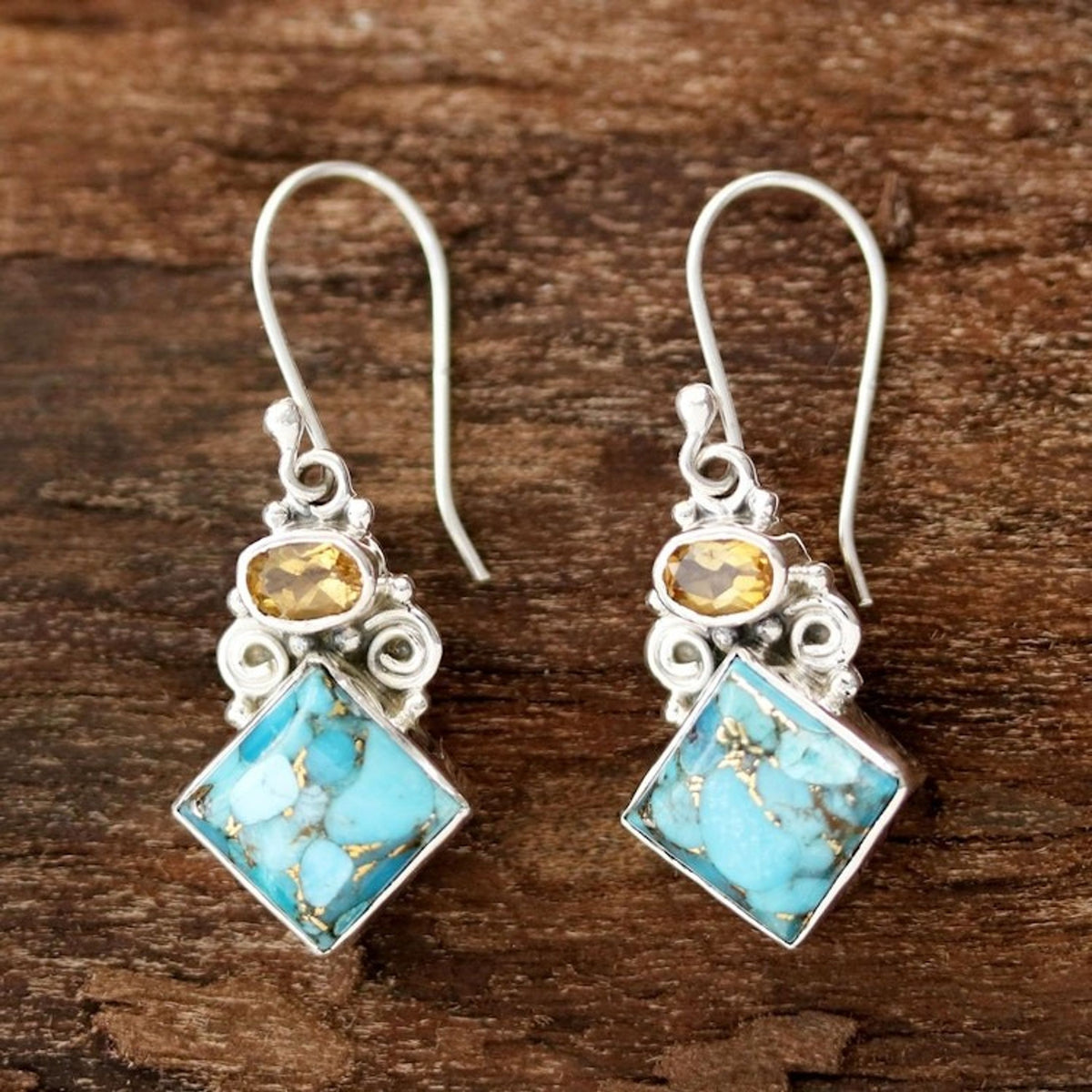 Handcrafted in India from 925 sterling silver with a combination finish, these hook earrings feature citrine and composite turquoise. They measure 1.5 inches L x 0.6 inches W x 0.3 inches D.
