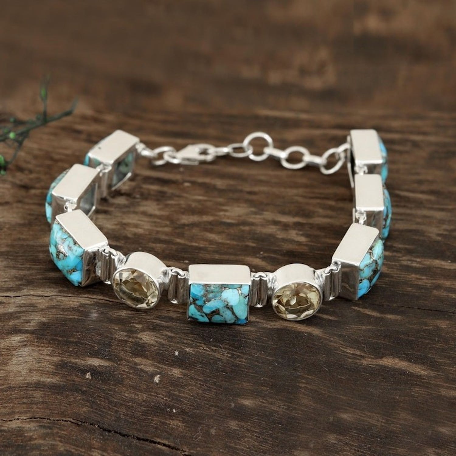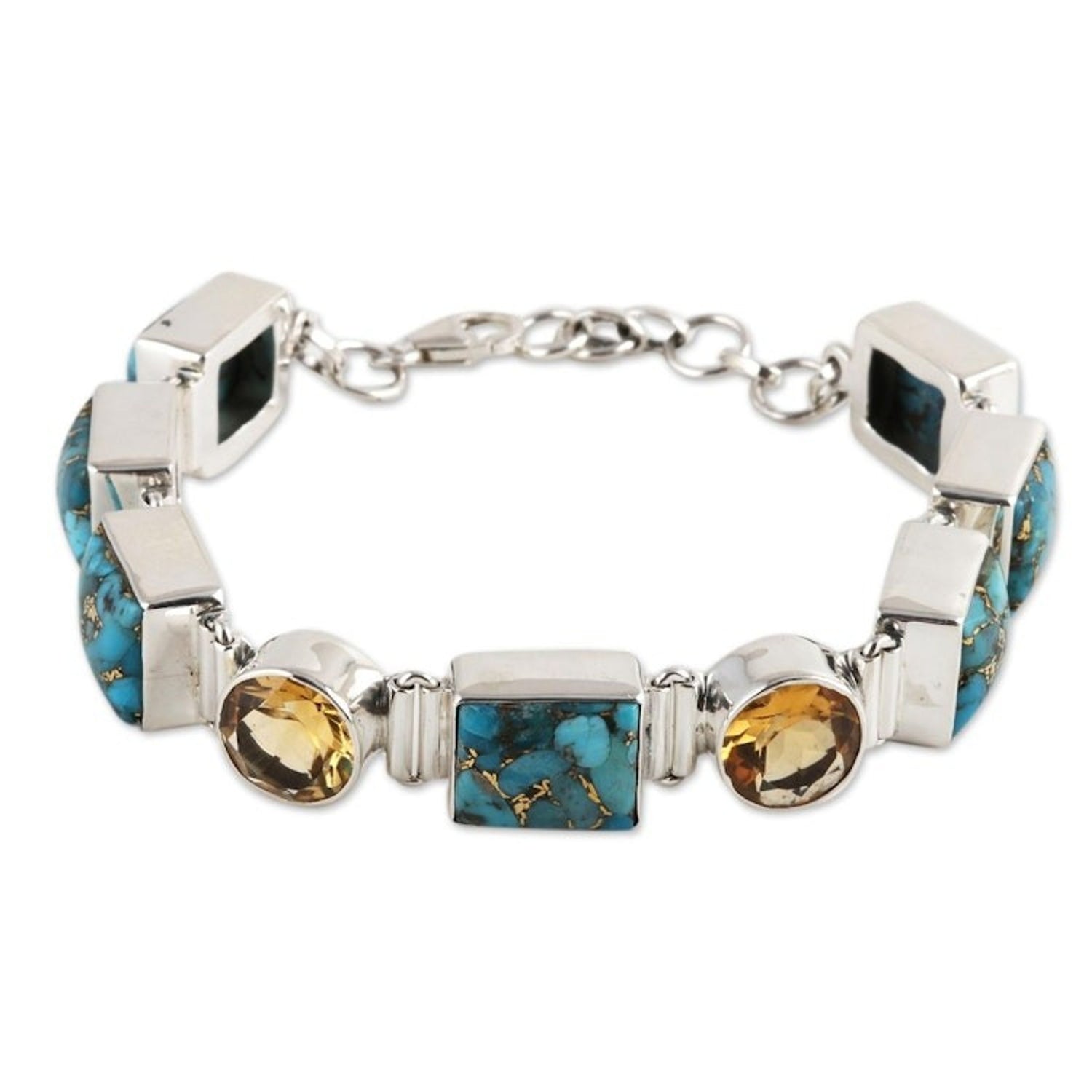 Handcrafted in India from 925 sterling silver with a combination finish, this link bracelet features citrine and composite turquoise. It is adjustable from 6.8 to 7.5 inches L x 0.4 inches W with a lobster claw clasp.