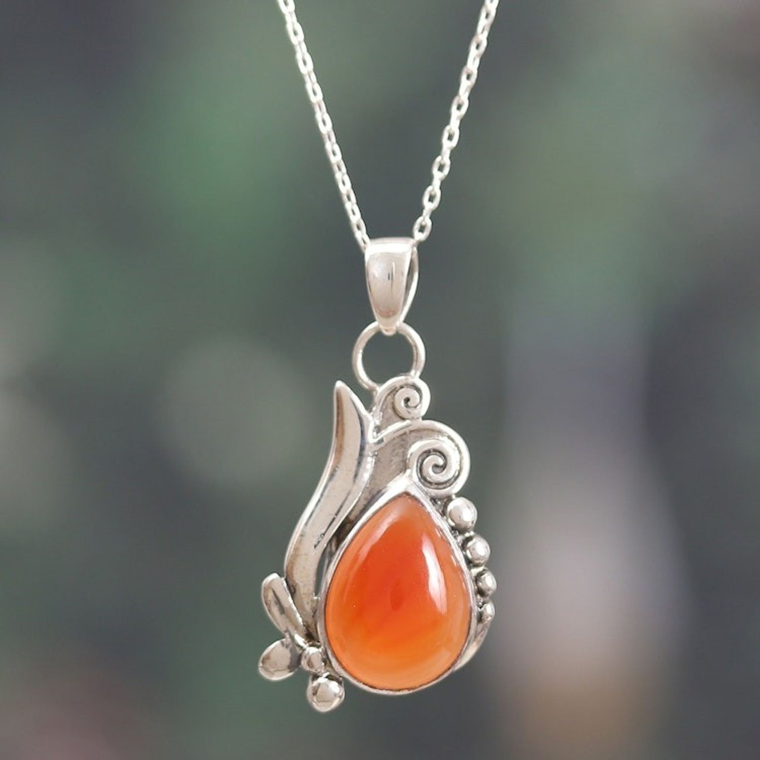 This Classic Polished Sterling Silver Carnelian Pendant Necklace 'Grand Sunset' by Parul is a sublime accessory made to shine with a warm light, a collaboration between Parul and a talented team of Indian artisans. Leafy details create a radiant aura around a carnelian cabochon, whose sunset light gracefully complements the design's tender vibe. As a self-taught designer blending traditional and modern styles, Parul infuses each piece with classic and contemporary charm, making this necklace a perfect representation of her unique vision.