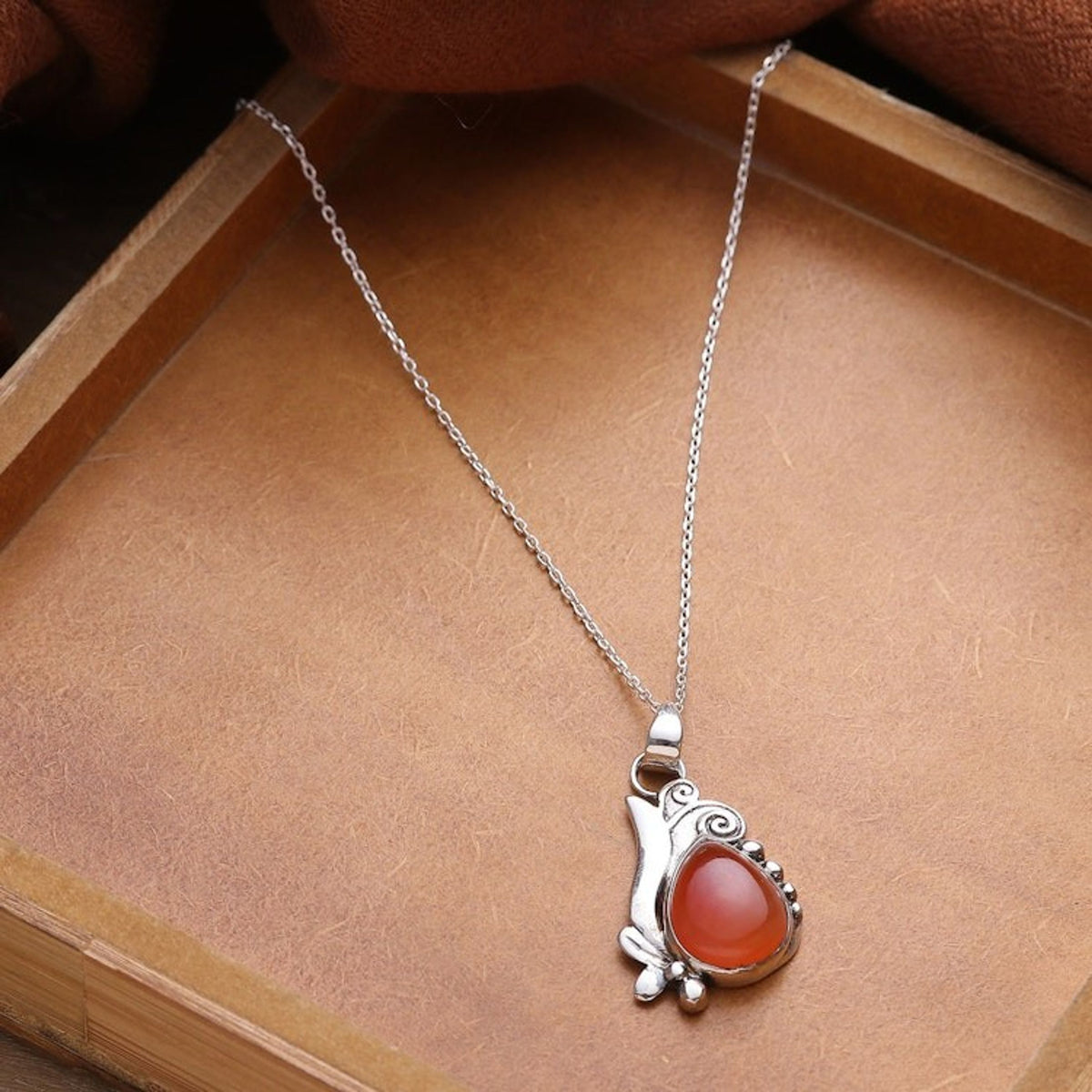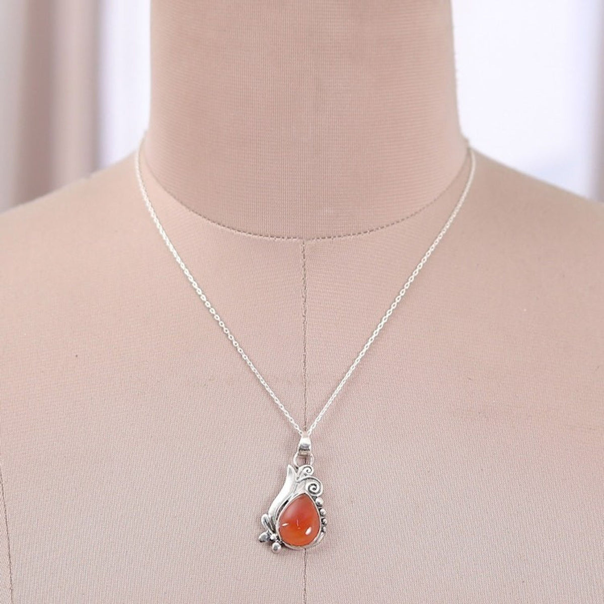 Handcrafted in 925 sterling silver with carnelian, this necklace features a combination finish and a cable chain with a spring ring clasp. It weighs 0.29 oz, with a length of 18 inches and a width of 1 mm. The pendant measures 1.6 inches L x 0.8 inches W x 0.2 inches D. The natural stone color and variegation will vary.