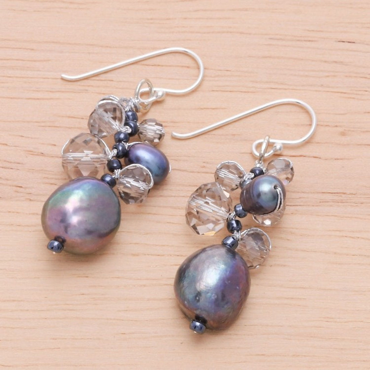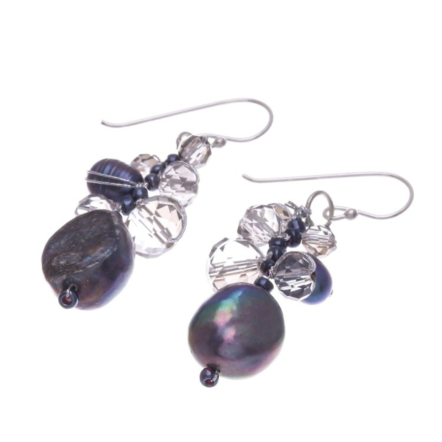 These Clear Glass Beaded Dangle Earrings with Black Pearls 'Rain of Mystery' by Nareerat are a radiant creation that merges mystery and elegance. Dedicated to the sophisticated woman, these dangle earrings feature clear glass beads that create a glorious illusion around black cultured pearls, which symbolize wealth and independence. The design is a testament to the Thai artisan’s mission to keep the art of handmade jewelry alive for future generations. These pieces are equipped with polished sterling silver hooks, allowing you to wear them in all their splendor.