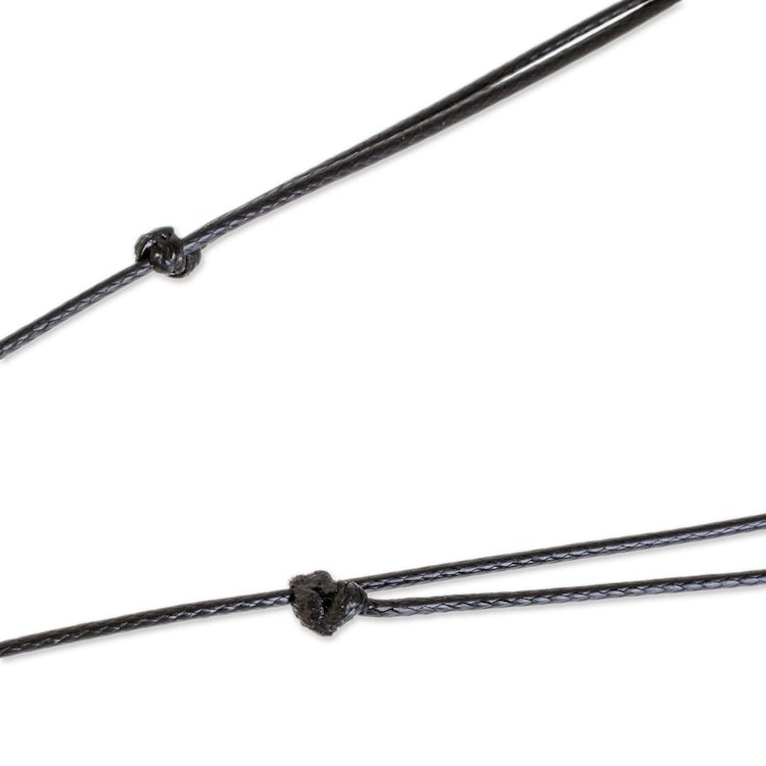 Handcrafted from coconut shell, lava stone, and resin with a black nylon cord, this necklace weighs 0.10 oz. The adjustable cord ranges from 14.5 to 29 inches in length with a 1 mm width. The round pendant measures 0.1 inches H x 1 inch in diameter. This item should avoid contact with water.