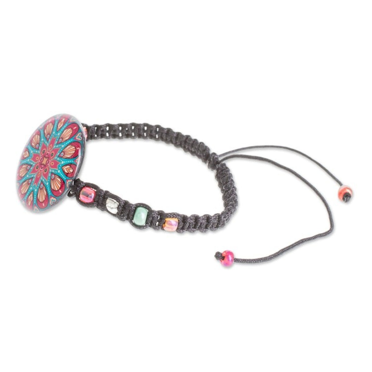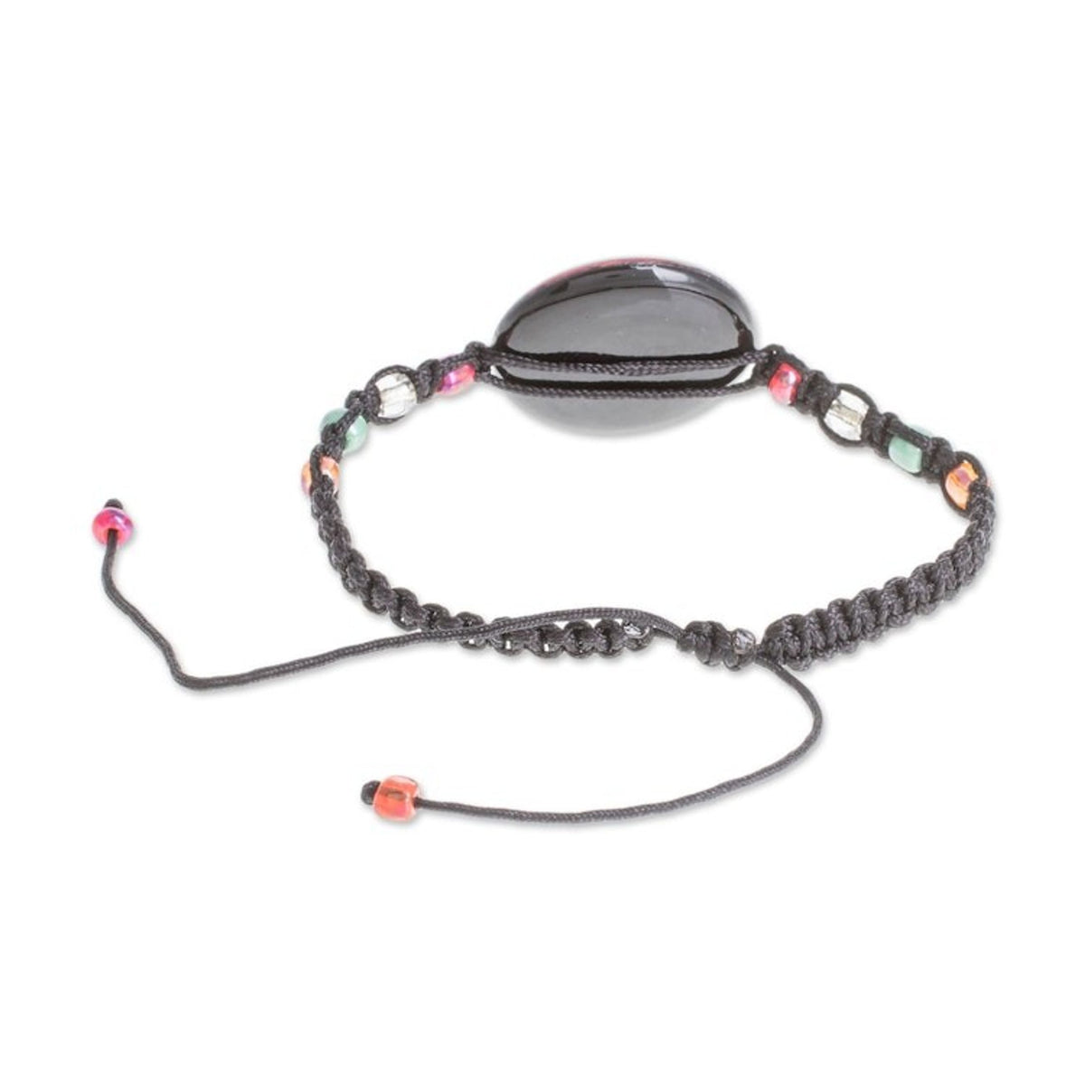 Handcrafted with glass beads, resin, and photograph on paper with a nylon cord, this bracelet weighs 0.14 oz. The adjustable macrame band ranges from 5 to 12 inches L and is 0.2 inches W. The round pendant measures 0.2 inches H x 1 inch in diameter. The color, size, and/or motif may vary slightly.