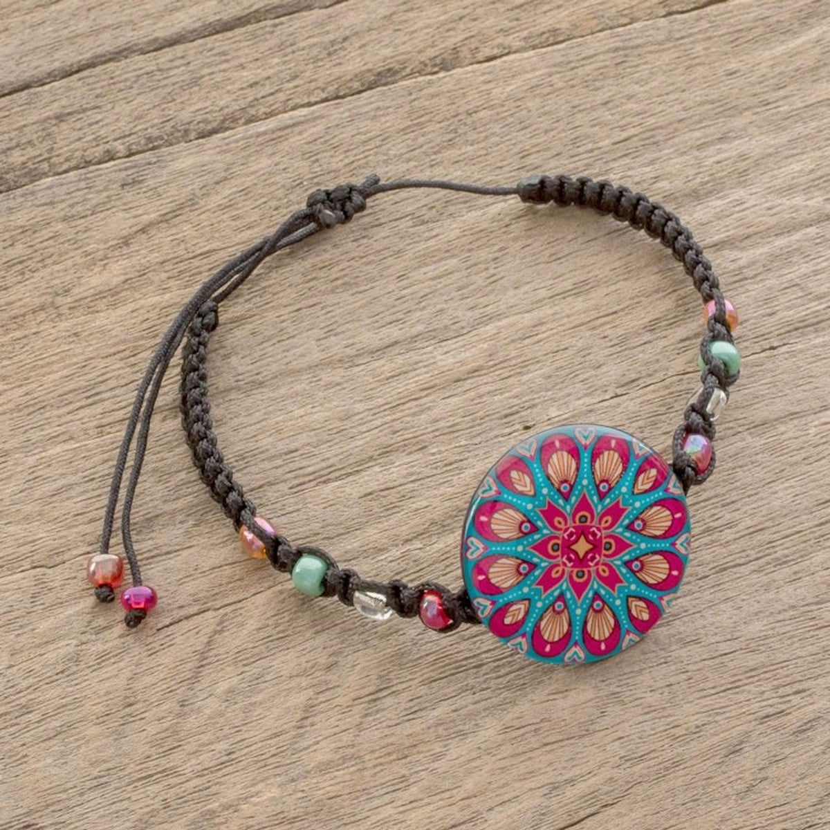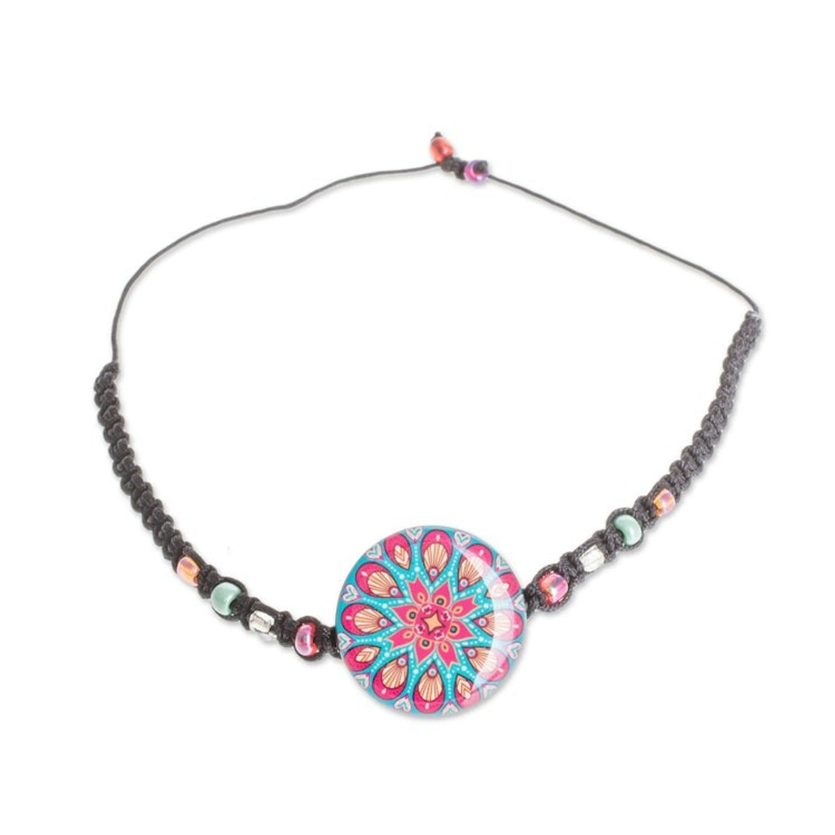 This Colorful Glass Beaded Macrame Pendant Bracelet 'Mesmerizing Colors' by Katherine Vargas features a mesmerizing, kaleidoscopic pendant. The colorful shapes are printed onto paper and coated in resin, reflecting the artisan's journey from a family of artists and her ability to turn a simple act of repairing earrings into a vocation. The pendant is accented with colorful glass beads and an adjustable macrame band with a sliding knot, showcasing the resilience and creativity infused into each handcrafted design.