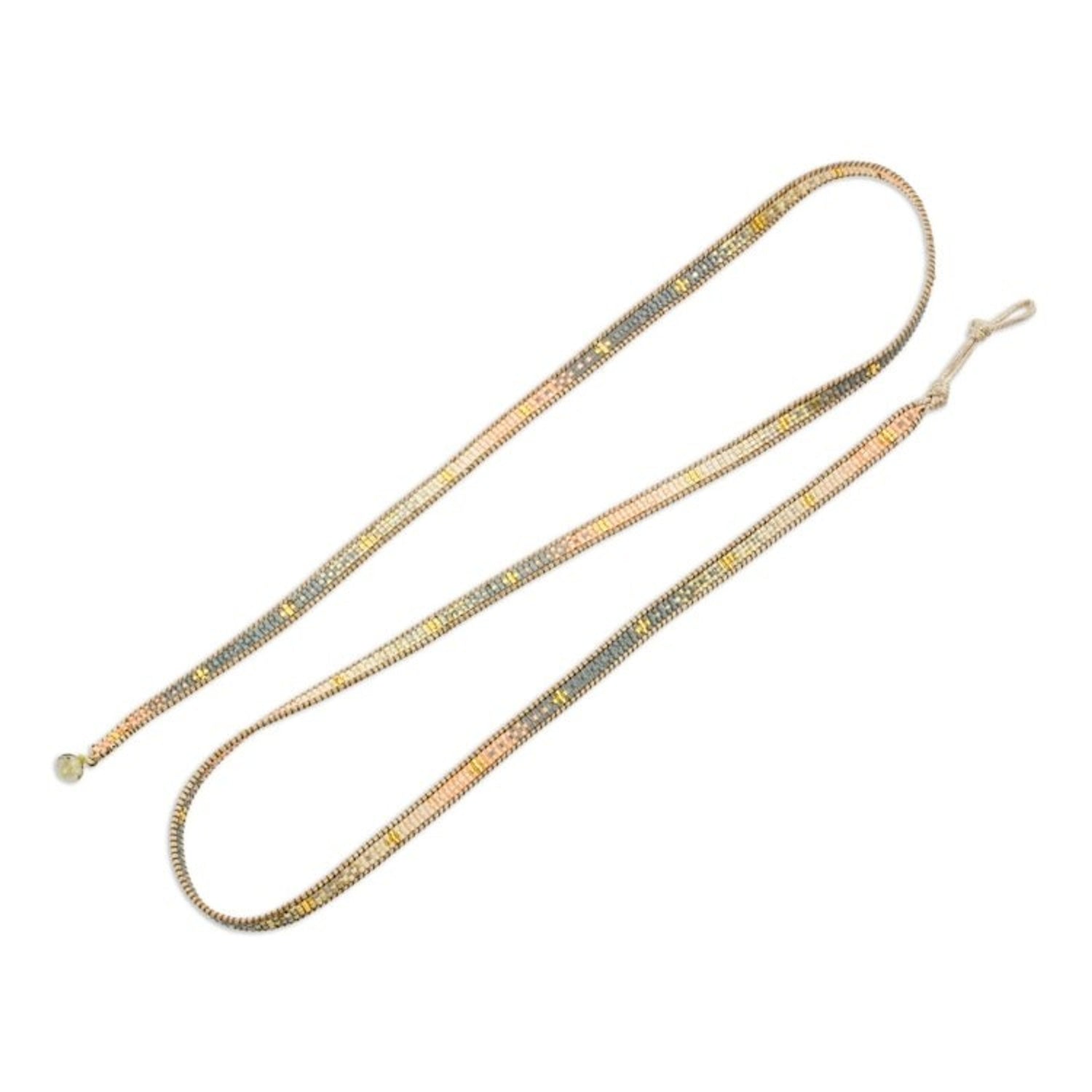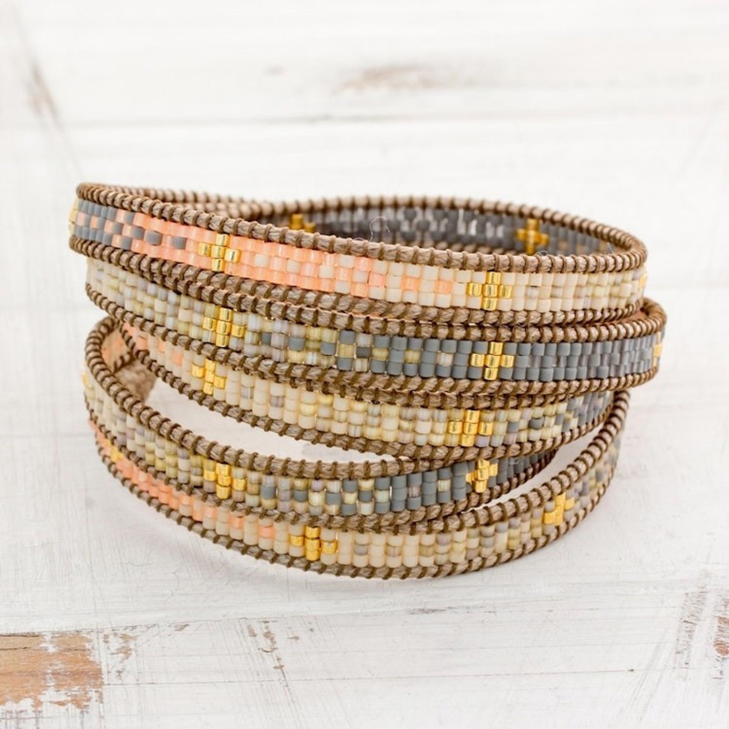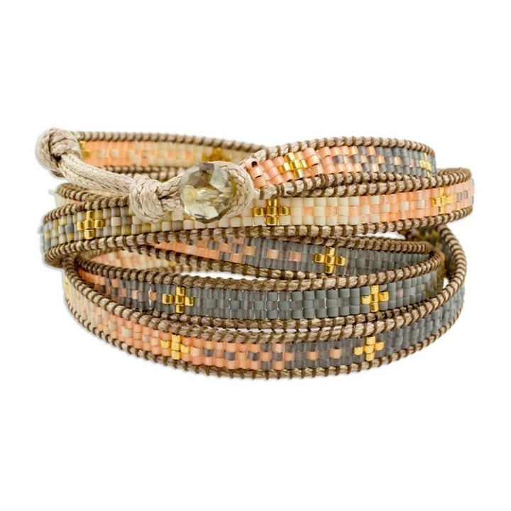 This Colorful Glass Beaded Wrap Bracelet from Guatemala 'Cerro de la Cruz in Grey' by Cristobal Ramirez is another stunning design inspired by the Cerro de la Cruz. This version features beautiful colors of beige, petal pink, and grey with golden cross shapes. The petite glass beads are meticulously hand-strung on nylon cord using a specialized loom, showcasing the artisan's dedication to preserving his craft. This piece embodies the spirit of freedom and cultural heritage, as the artisan uses his skills to provide stable income and dignity to local families.