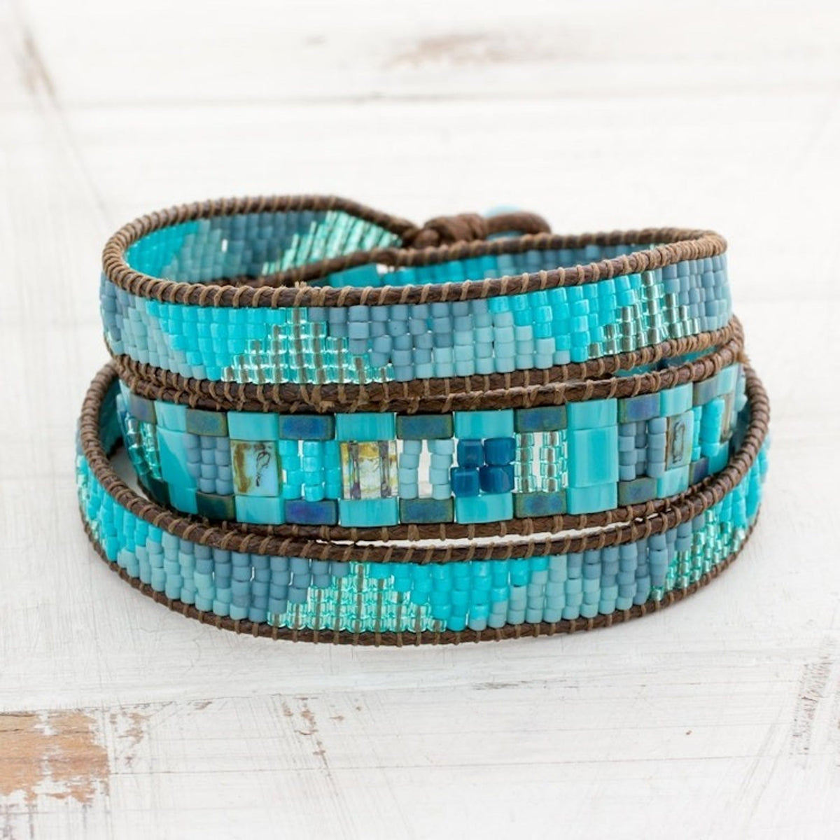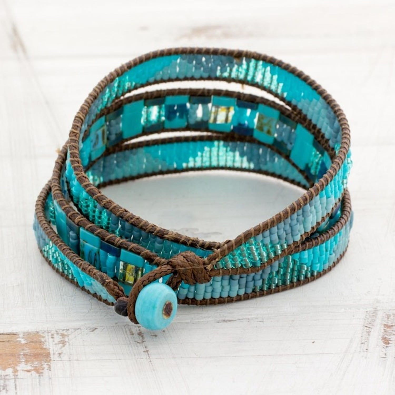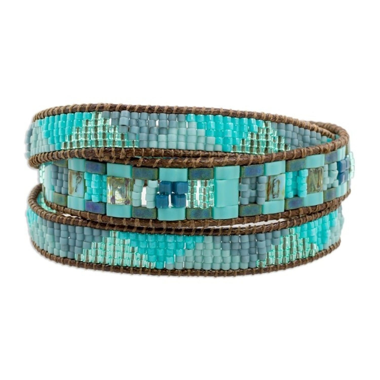 This Colorful Glass Beaded Wrap Bracelet from Guatemala 'Country River' by Cristobal Ramirez possesses the beauty of a countryside river. Guatemalan artisan Cristobal Ramirez meticulously strings petite beads of blue glass on a small, specialized loom. The design features triangle motifs that flank a central segment with various-sized beads. This bracelet is a testament to the artisan's resilience and deep love for color and form, nurtured since he was a child.
